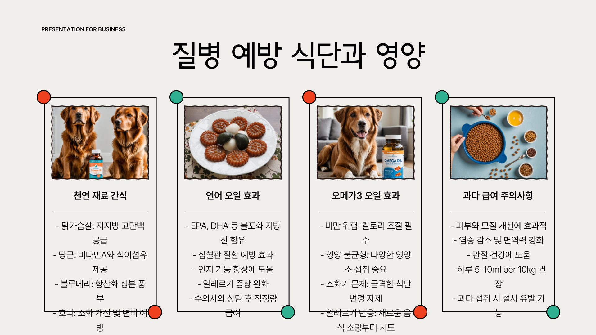 특히 연어 오일이나 오메가3 오일은 피부 트러블 예방에 효과적입니다. 단, 너무 과하게 주면 설사를 유발할 수 있으니 하루 급여량을 철저히 지켜야 해요. 그리고 기본적으로 양질의 사료를 중심으로 급여하되, 보조 식품은 수의사 상담을 거쳐 도입하는 것이 가장 안전합니다.