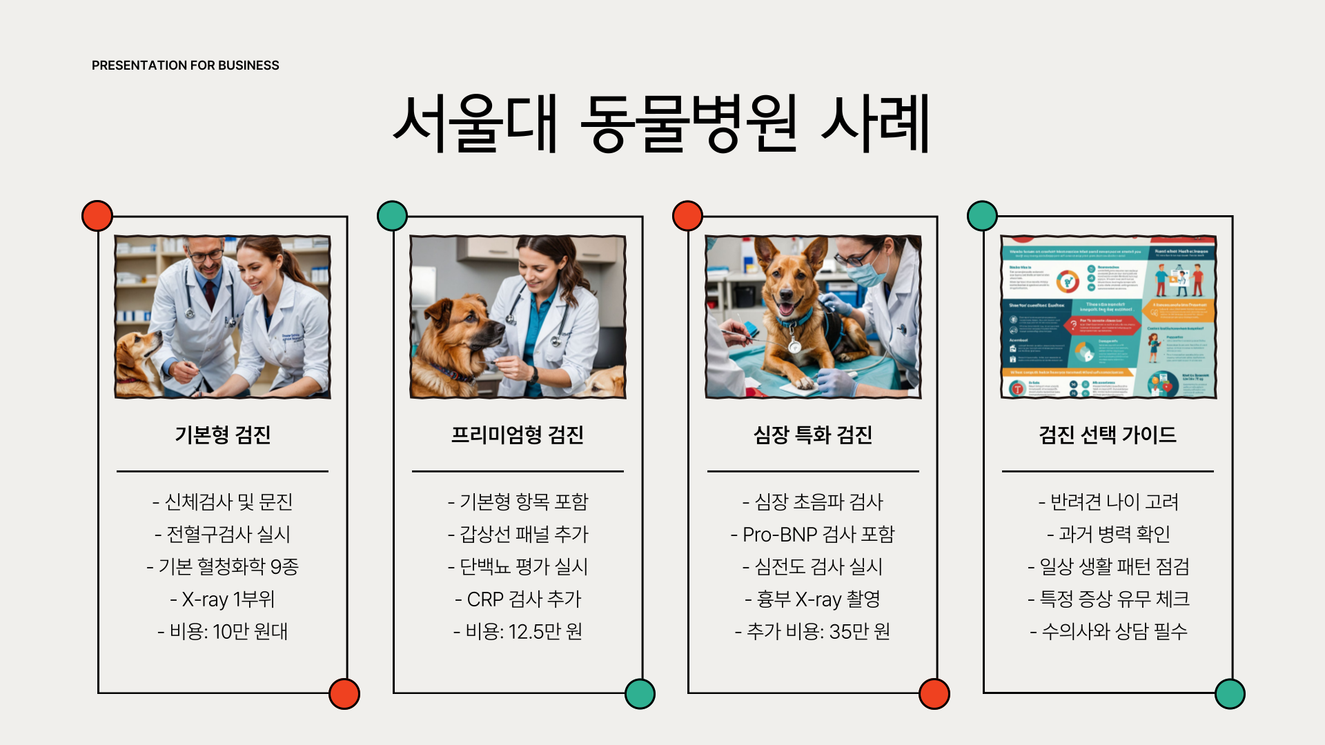예를 들어 제가 경험한 서울대 동물병원의 건강검진은 기본형이 10만 원대였고, 여기에 갑상선 패널, CRP, 단백뇨 평가 등이 포함된 프리미엄형은 12.5만 원 정도였어요. 고령견이라 심장 특화(35만 원)까지 추가하니 꽤 비용이 나갔지만, 결과적으로는 조기 진단에 큰 도움이 됐습니다.