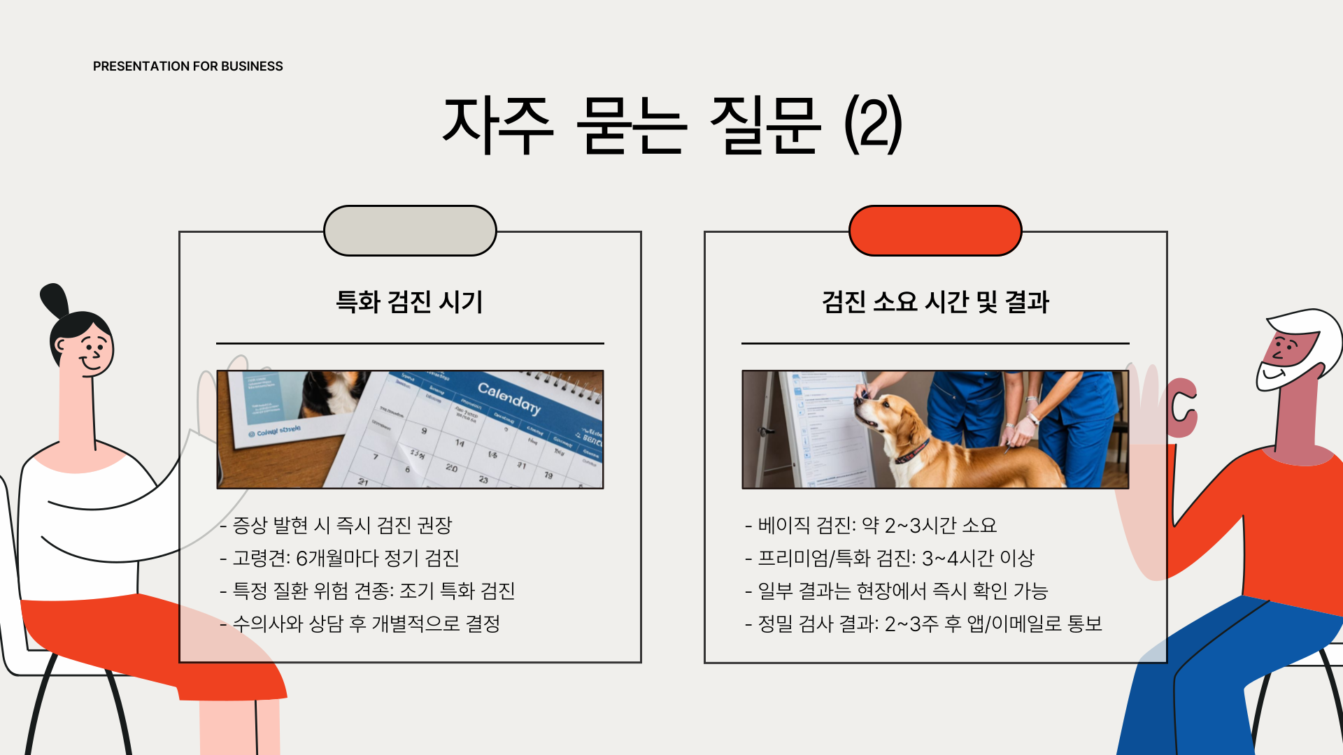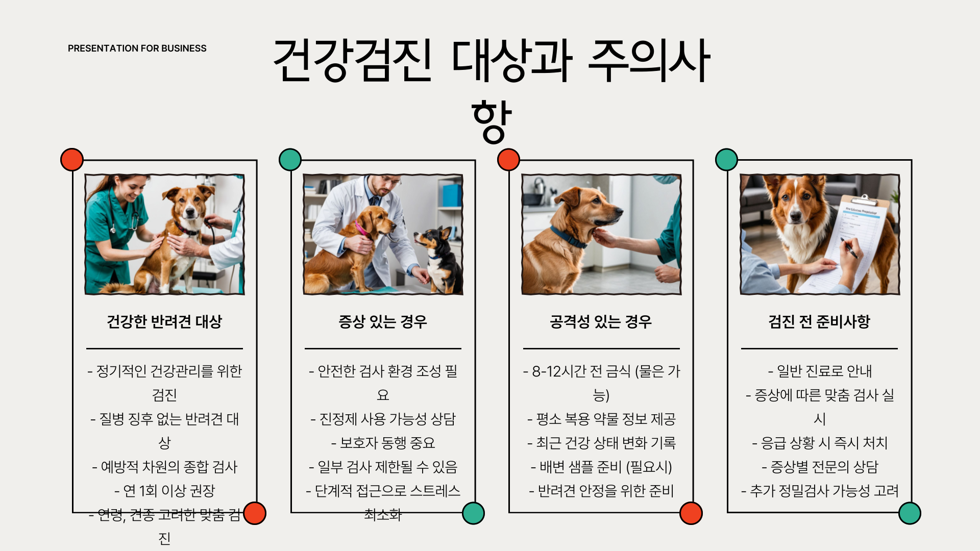 다만, 검진 대상은 ‘건강한 반려견’입니다. 이미 증상이 명확한 경우에는 일반 진료로 안내되며, 공격성이 심한 경우에는 일부 검사가 제한될 수 있어요. 또, 일부 검사는 금식이 필수이므로 예약 전에 반드시 병원 지침을 숙지해야 합니다.