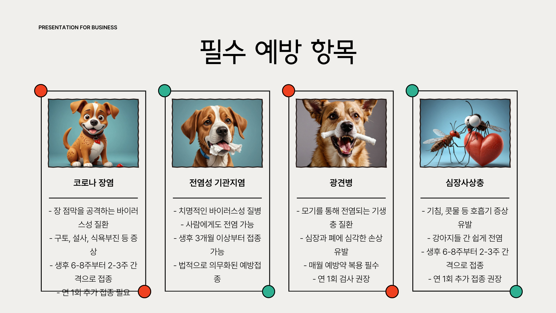 그 외에도 코로나 장염, 전염성 기관지염, 광견병, 심장사상충 예방은 필수입니다. 특히 심장사상충은 매년 1회 진단과 월 1회 약 복용이 필수인데, 초기에 감염되면 회복이 어렵기 때문에 사전 예방이 정말 중요하죠.