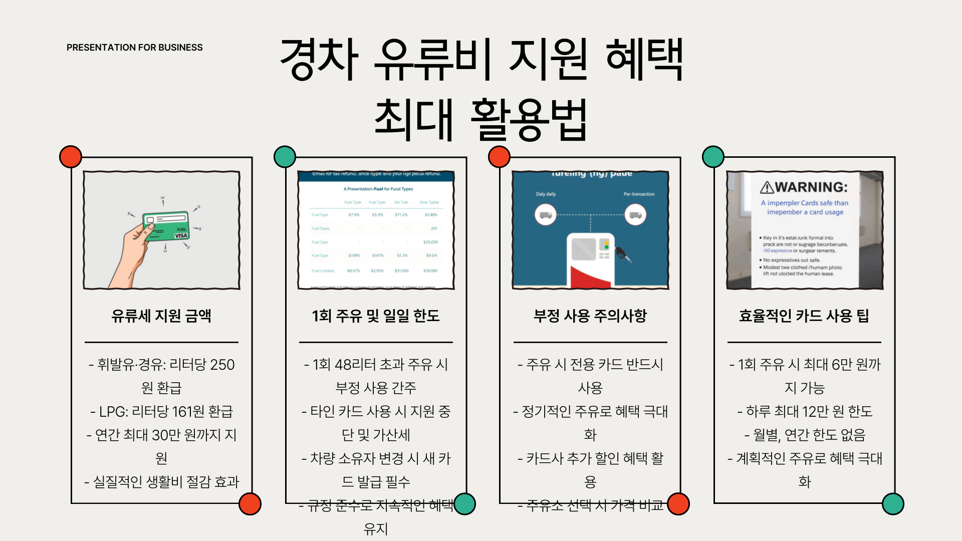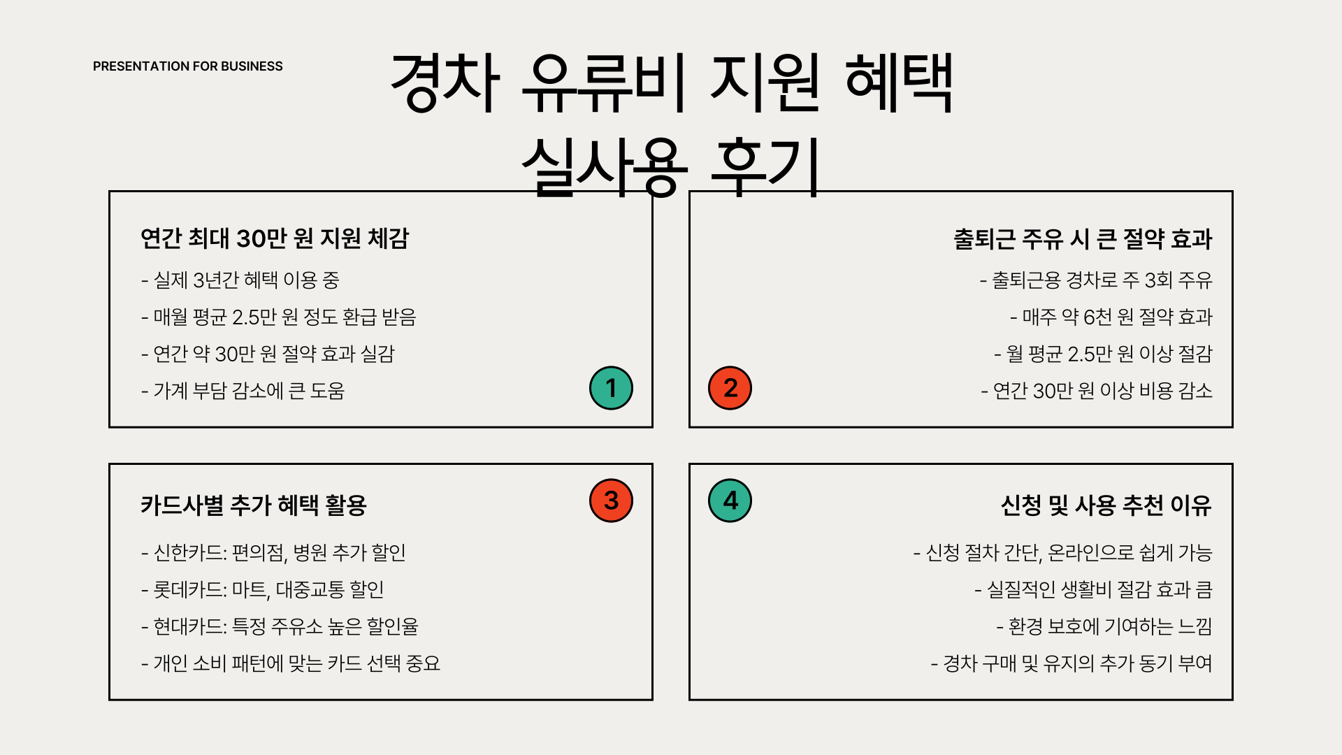 경차를 이용하시는 분이라면 절대 놓쳐서는 안 될 혜택이 바로 '경차 유류비 지원 제도'입니다. 연간 최대 30만 원까지 지원받을 수 있는데요, 이 제도를 통해 생활비 절약 효과를 톡톡히 누릴 수 있습니다!