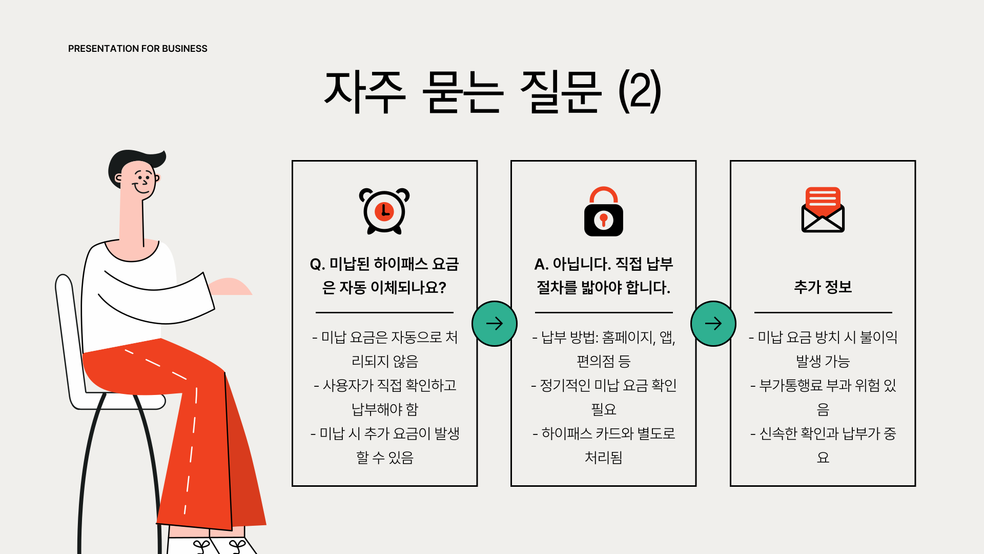 A. 아니요. 미납 발생 당일은 조회가 불가능하며, 최소 하루 이후에 조회 가능합니다. - Q. 미납된 하이패스 요금은 자동 이체되나요?