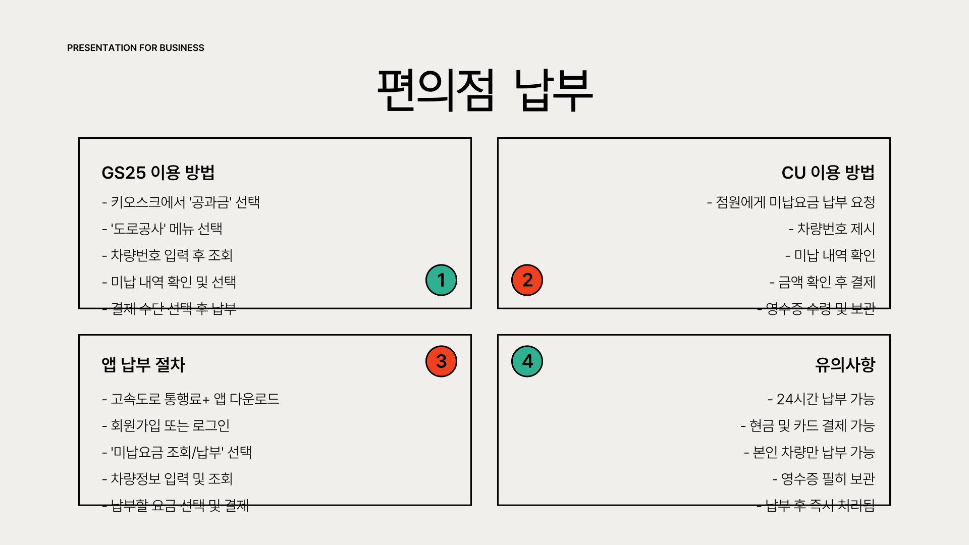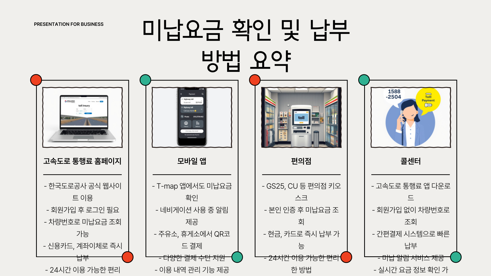 고속도로 미납요금은 여러 방법으로 납부할 수 있어요. 예전에는 영업소에 가서 납부해야 했지만, 요즘은 스마트폰이나 PC, 심지어 편의점에서도 쉽게 납부가 가능합니다. 미납요금 납부는 아래와 같은 경로로 할 수 있어요: