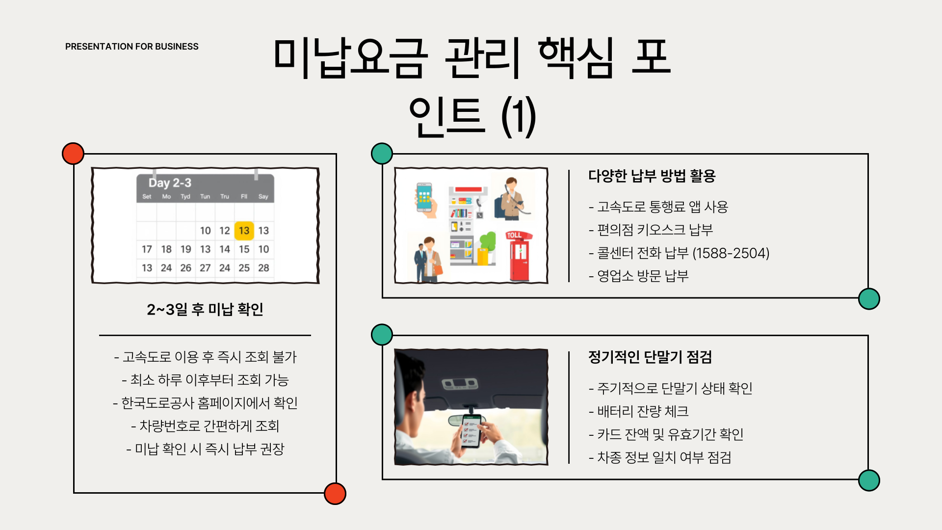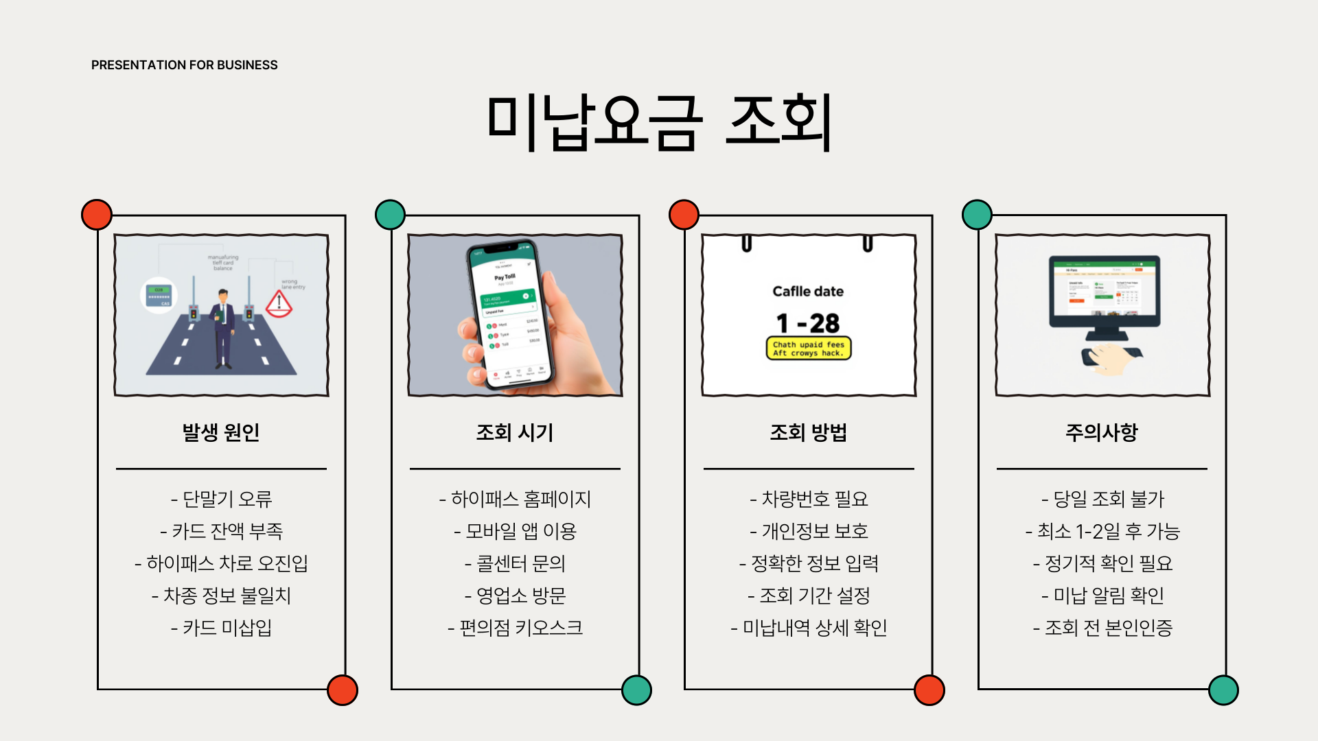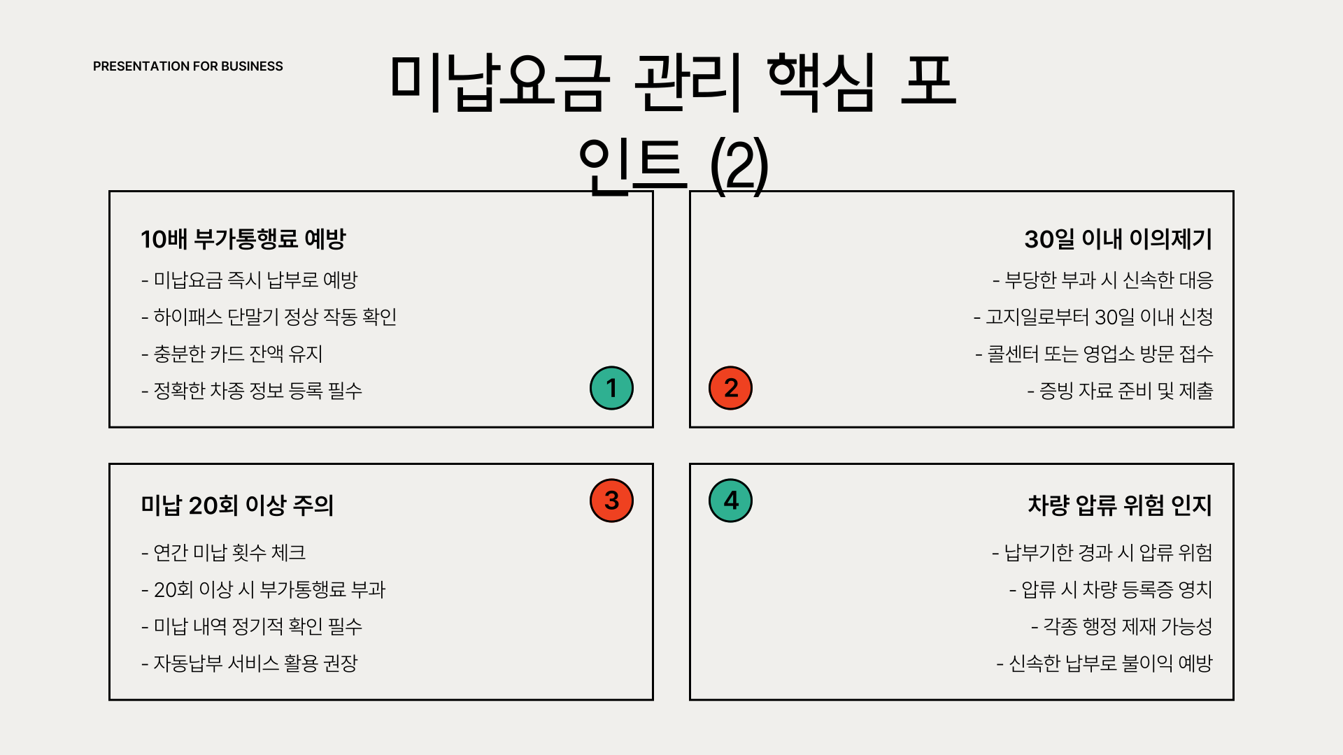고속도로 미납요금은 사소한 실수로도 발생할 수 있지만, 방치하면 부가통행료와 차량압류까지 이어질 수 있습니다. 고속도로 통행료 홈페이지나 모바일 앱, 편의점, 콜센터 등 다양한 방법으로 빠르게 확인하고 납부할 수 있으니, 정기적으로 체크하시고 미납이 생기면 즉시 처리하시길 바랍니다. 정리하자면: