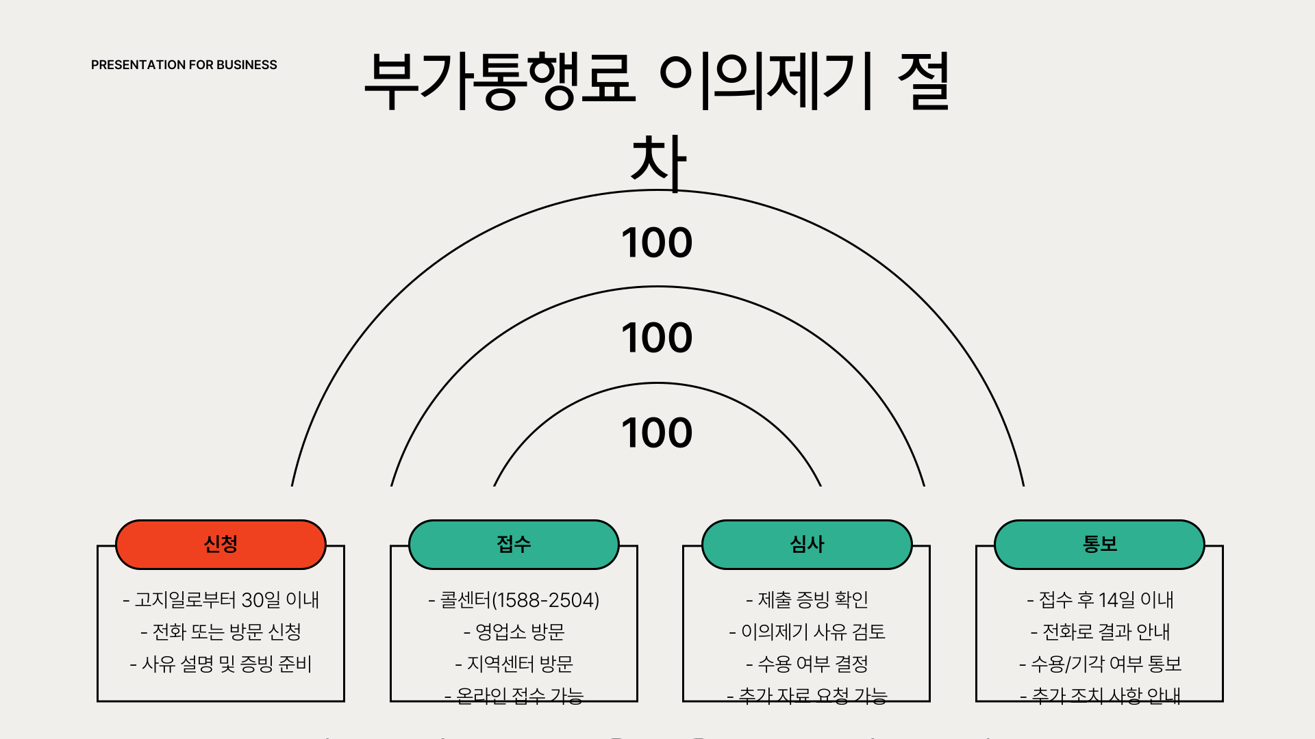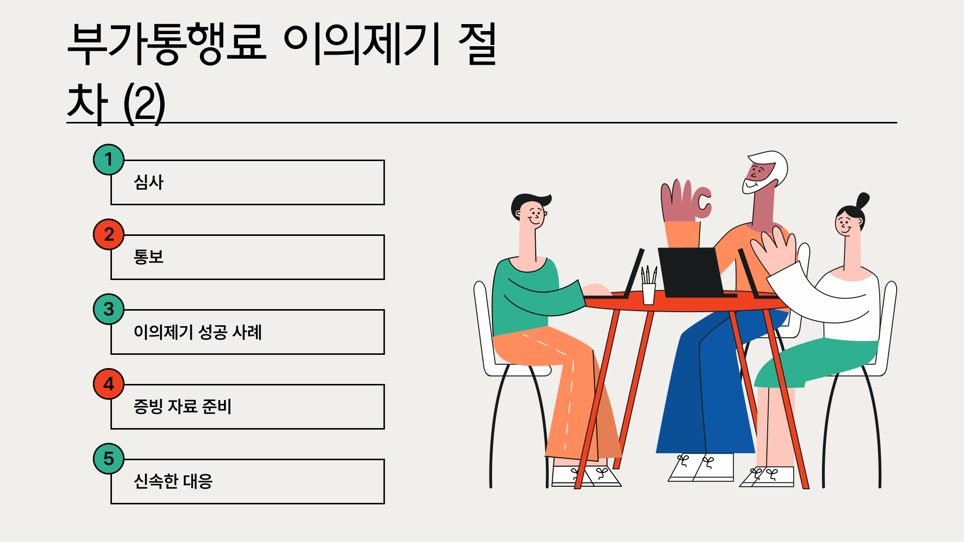 부가통행료가 부과됐는데 부당하다고 생각되시나요? 그럴 땐 반드시 정해진 기한 내에 이의제기를 하셔야 합니다. 이의제기 절차는 다음과 같습니다:
