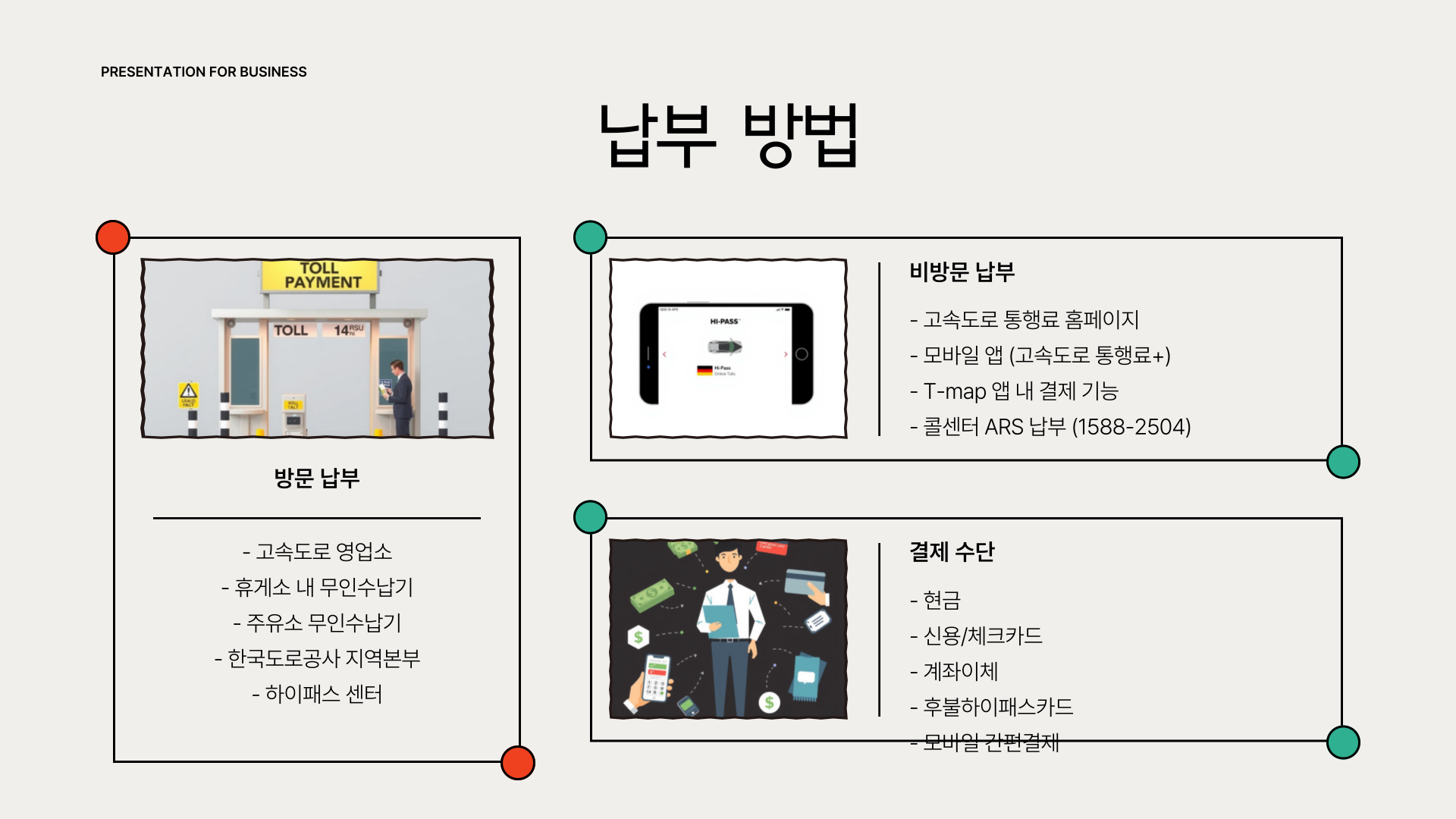 - 결제수단: 계좌이체, 현금, 후불하이패스카드, 신용/체크카드 등
