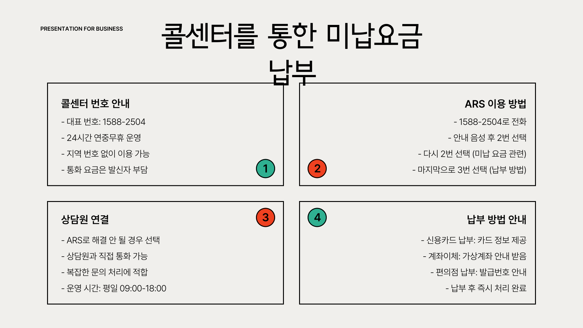 이처럼 시간과 장소에 구애받지 않고 간편하게 납부할 수 있는 방법이 많으니, 꼭 기억해두시기 바랍니다.