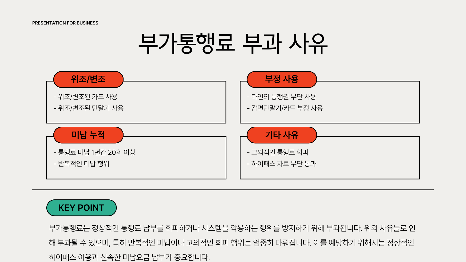 미납요금을 계속 방치하면 '부가통행료'라는 무서운 벌금이 부과될 수 있습니다. 그 금액은 무려 10배까지 늘어날 수 있는데요. 유료도로법 시행령 제14조에 따라 아래와 같은 경우에 부과됩니다: