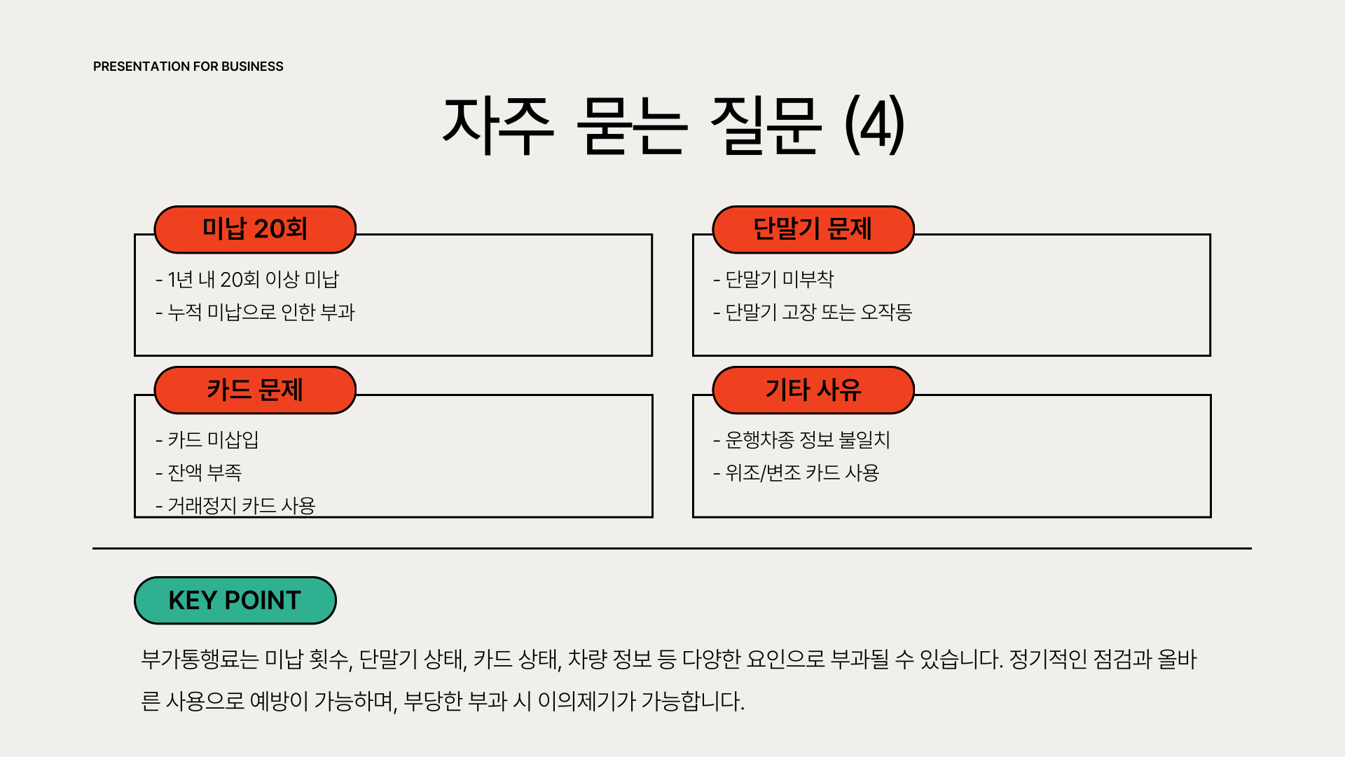 A. 미납 20회 이상, 단말기 미부착, 카드 미삽입 등의 사유가 있을 때 부과됩니다. - Q. 납부기한이 지나면 어떻게 되나요?