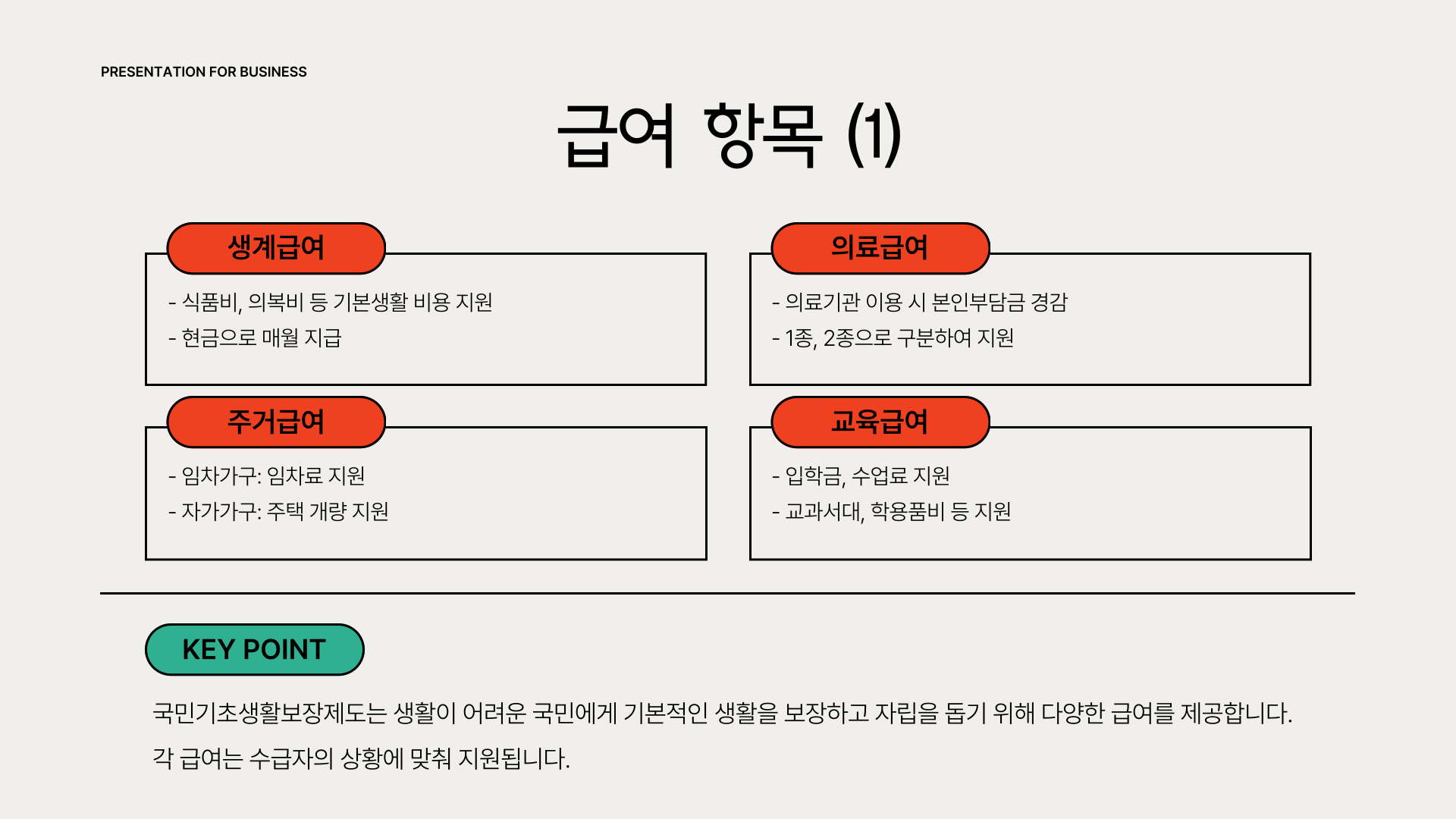 - 생계급여: 의복, 음식물, 연료비 등 일상생활에 필수적인 현금 지급