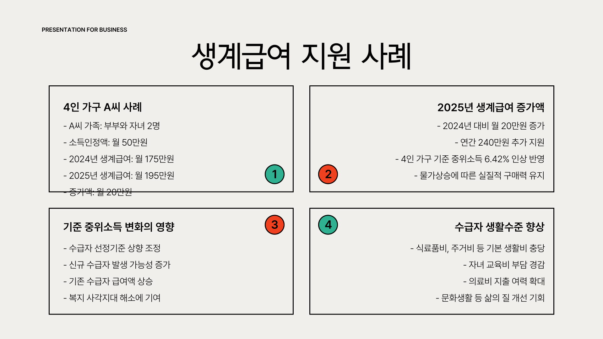 - 생계급여 외에도 주거·교육·의료급여가 함께 지원됩니다.