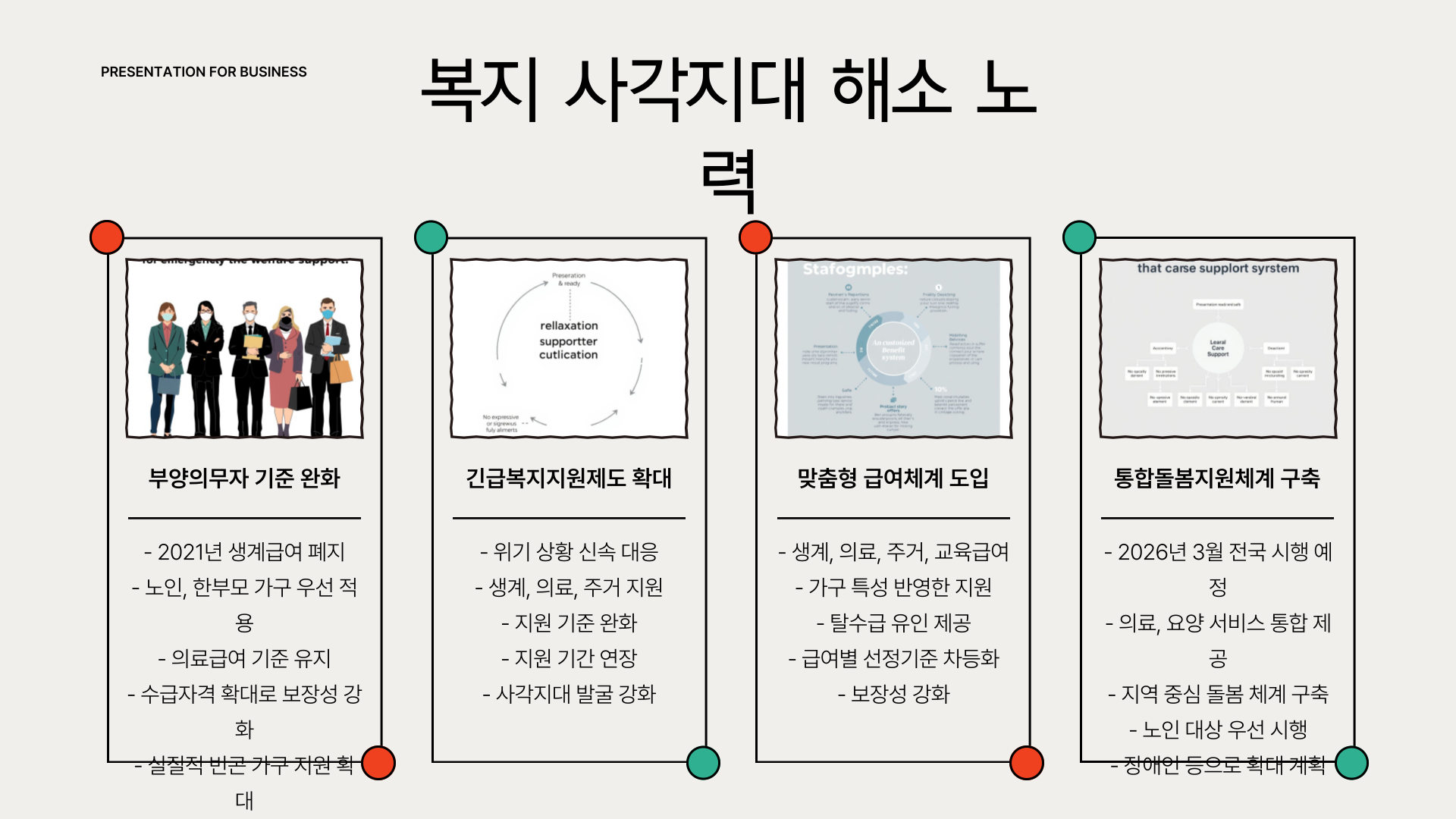 국민기초생활보장 사업은 개인의 생계, 주거, 의료, 교육, 자활 등 일상생활에 필수적인 영역에 대해 실질적인 지원을 제공합니다. 특히 근로능력 유무에 따라 단순 현금급여 외에도 자활을 위한 프로그램을 제공하는 등 복지의 사각지대를 최소화하고 있습니다.