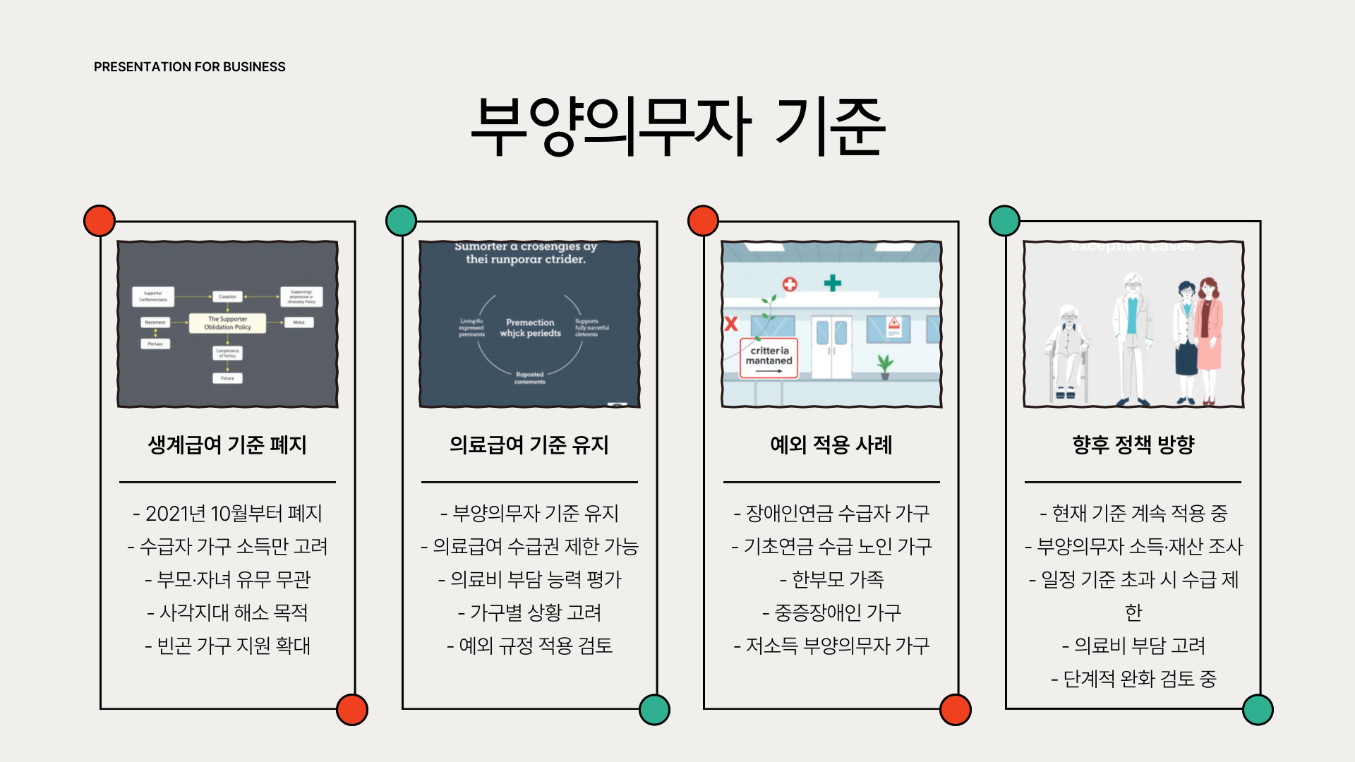예외 적용 기준도 다양합니다. 예컨대 부양의무자의 소득이 중위소득의 50% 미만이고 부양능력이 없는 경우, 기준을 충족한 것으로 판단됩니다. 장애인 연금 수급자, 기초연금 수급 노인이 있는 경우도 마찬가지입니다.