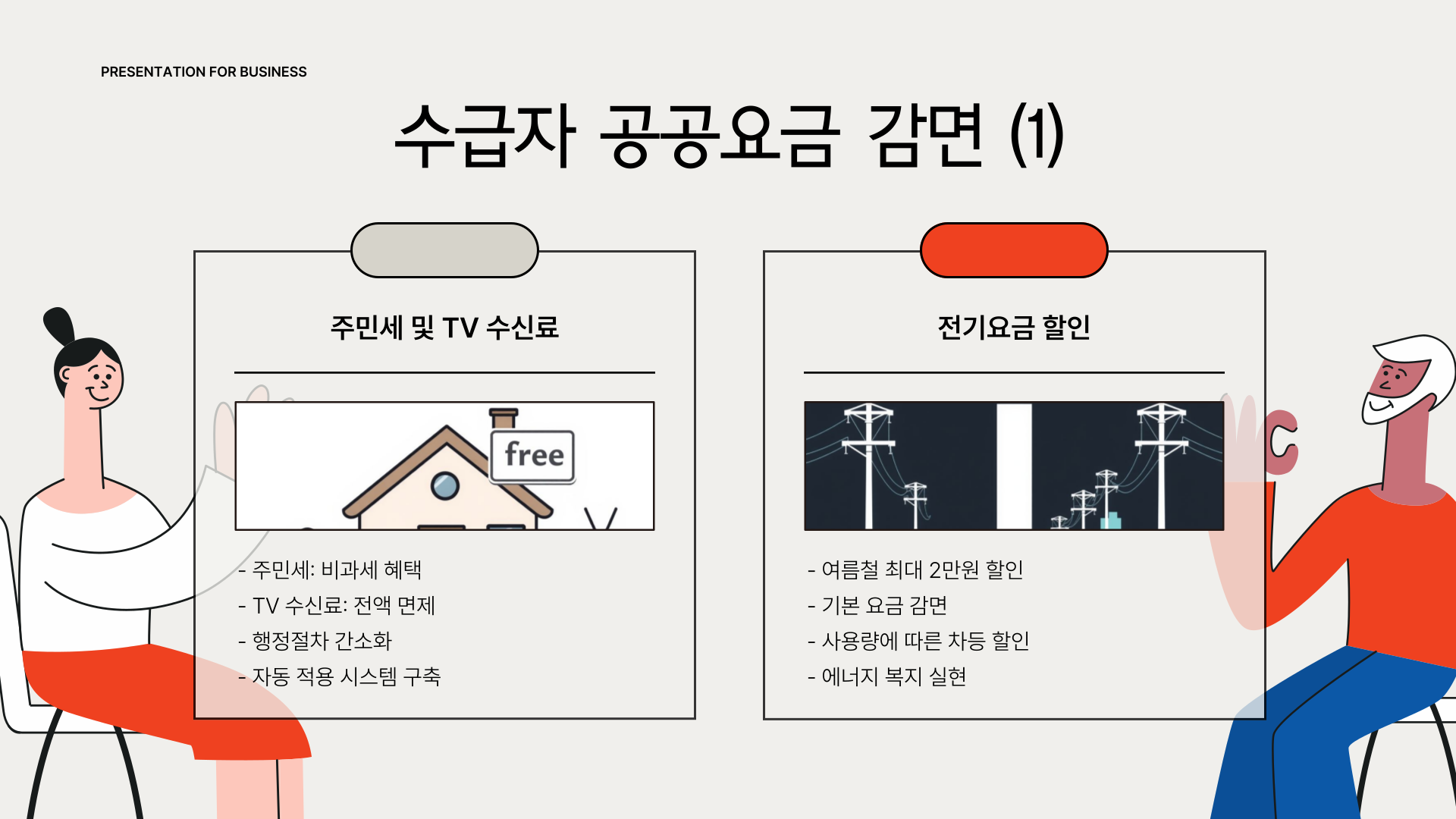 수급자로 선정되면 다양한 공공요금 감면 혜택도 함께 받을 수 있습니다. 이를 놓치지 않도록 챙겨보세요: