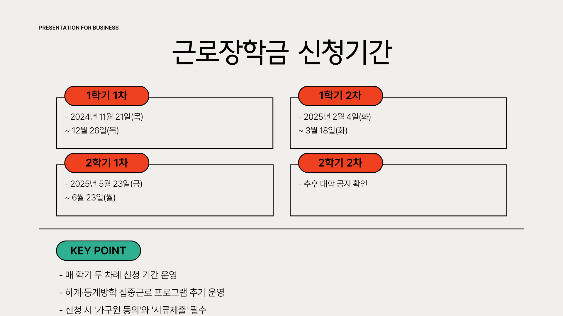 국가근로장학금은 매 학기 두 차례의 신청기간이 운영되며, 하계·동계방학에 맞춰 ‘방학 집중근로 프로그램’도 추가로 운영됩니다.