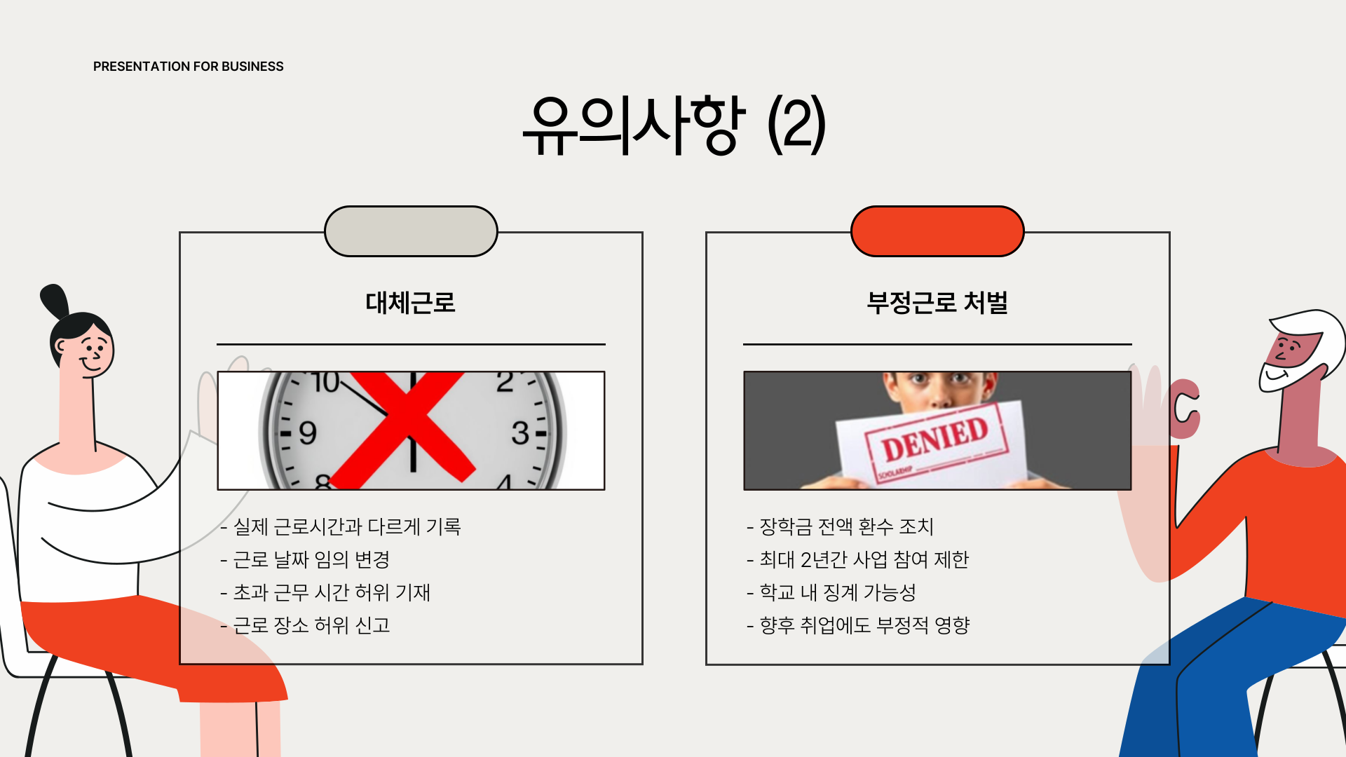 - ❌ 허위/대리/대체 근로는 절대 금지