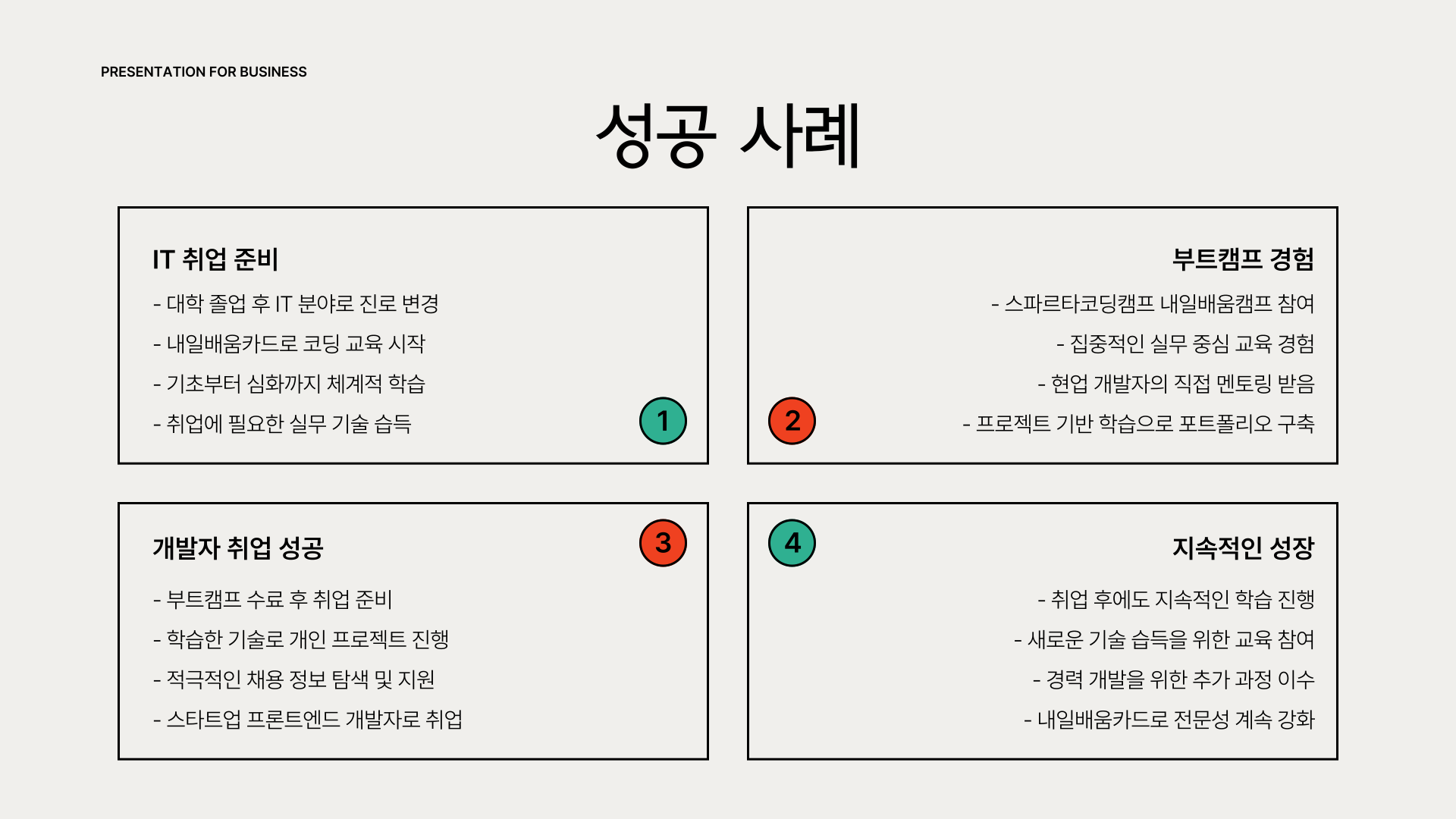 제가 IT 취업을 고민하던 시기에 이 부트캠프를 통해서 코딩 공부 시작했고, 지금은 작은 스타트업에 프론트엔드 개발자로 일하고 있답니다 😄