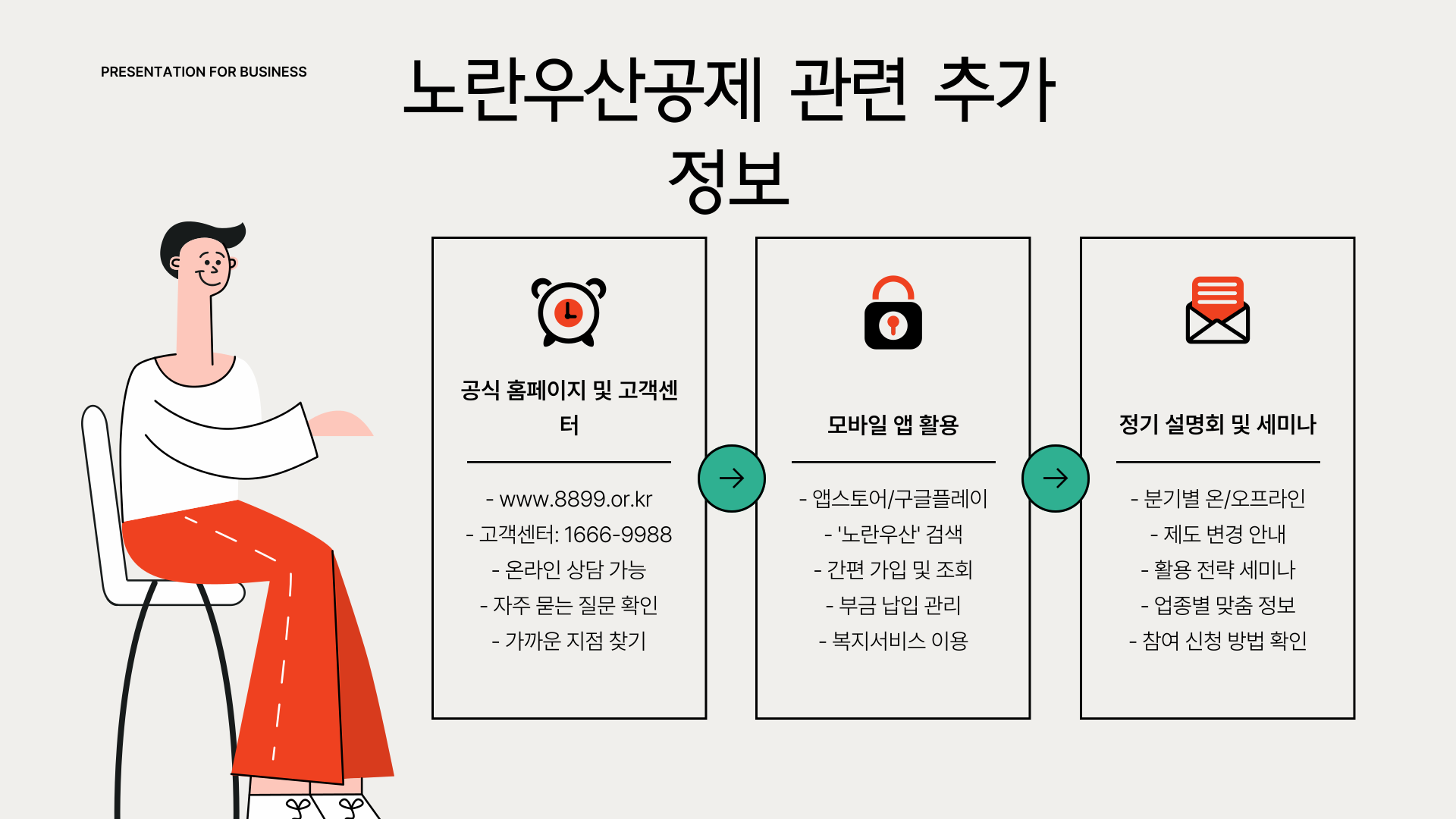 노란우산공제는 단순한 저축이 아닙니다. 법적 보호 아래 운용되고, 소득공제 혜택까지 제공되며, 예상치 못한 위기에서 든든한 재정적 지원이 될 수 있는 제도입니다. 홈페이지에서 제공하는 서비스는 공제금 조회, 부금 변경, 대출 신청, 복지플러스 이용 등으로 매우 편리하며, 모바일 앱에서도 거의 모든 기능을 처리할 수 있어 바쁜 사업자 입장에서는 큰 장점입니다.