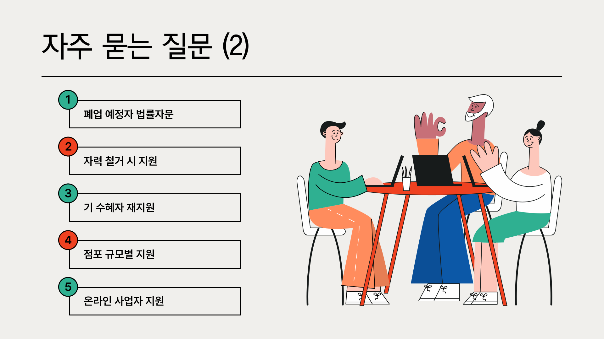 예를 들어 저는 1년 넘게 음식점을 운영하다가 코로나 이후 폐업했는데, 당시 조건을 모두 충족했더라면 법률자문부터 철거비까지 지원받을 수 있었습니다. 이 제도는 그런 분들을 위한 안전망입니다.