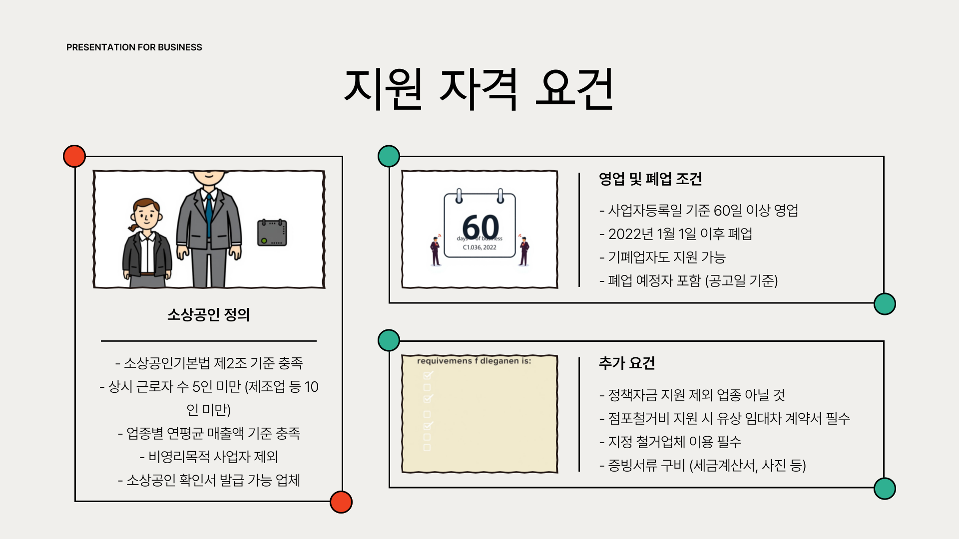 소상공인 폐업지원금은 단순히 돈만 지급하는 게 아닙니다. 폐업 이후 새 출발을 돕는 재기 설계 시스템입니다. 자격 요건은 다음과 같습니다.