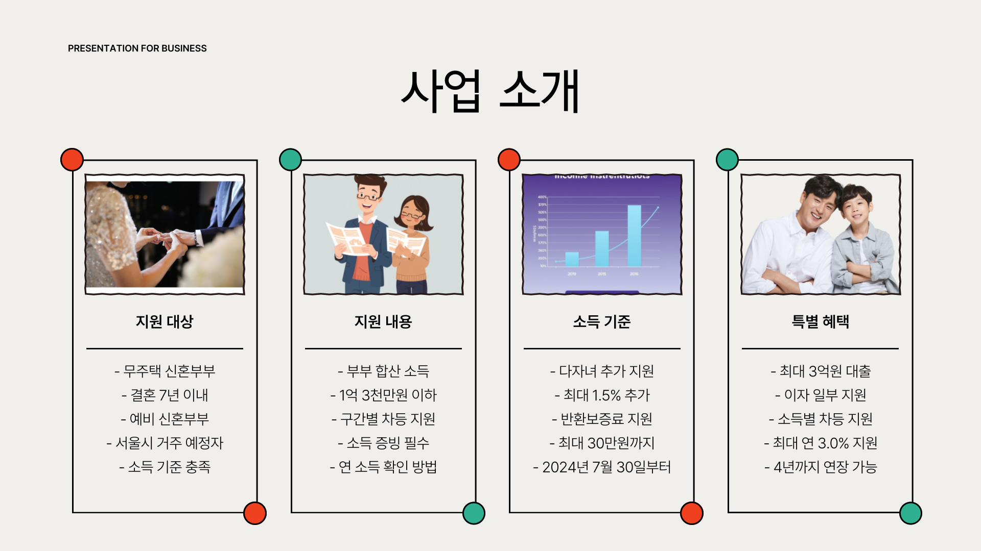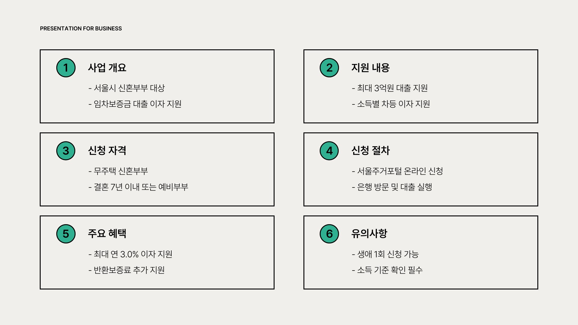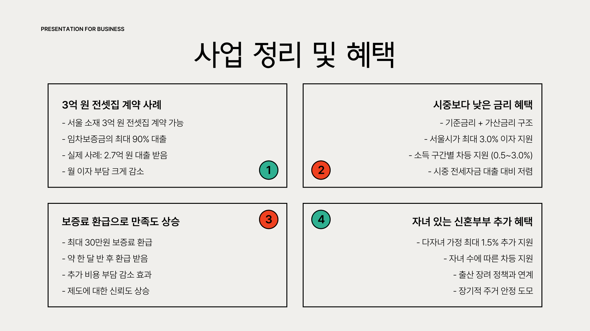 이 사업은 서울에 거주 중인 무주택 신혼부부 또는 결혼 예정자에게 보증금 대출과 이자지원을 해주는 제도입니다. 특히 소득구간별로 이자 차등 지원이 되어 경제적으로 부담을 많이 줄일 수 있었어요.