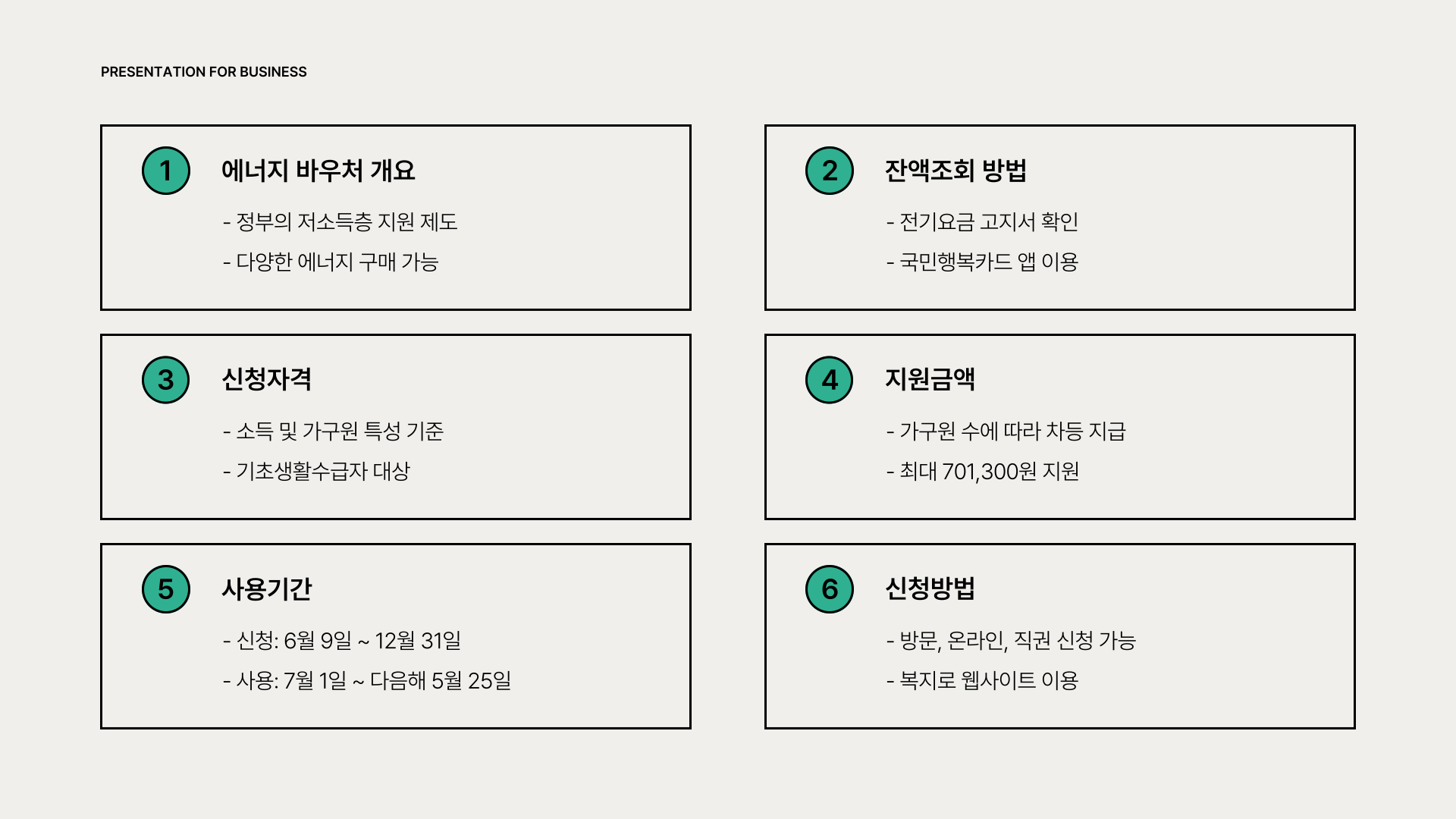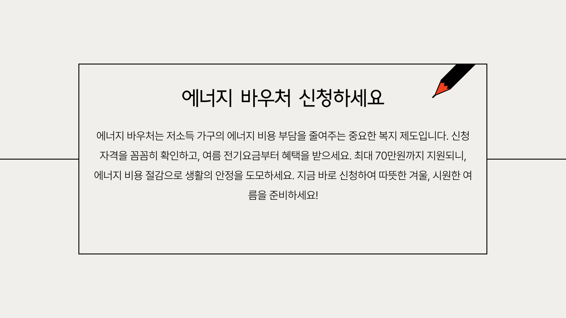 ✔️ 에너지 바우처는 여름철 냉방, 겨울철 난방 등 에너지비 부담이 큰 계절에 큰 도움이 되는 국가 복지 제도입니다.