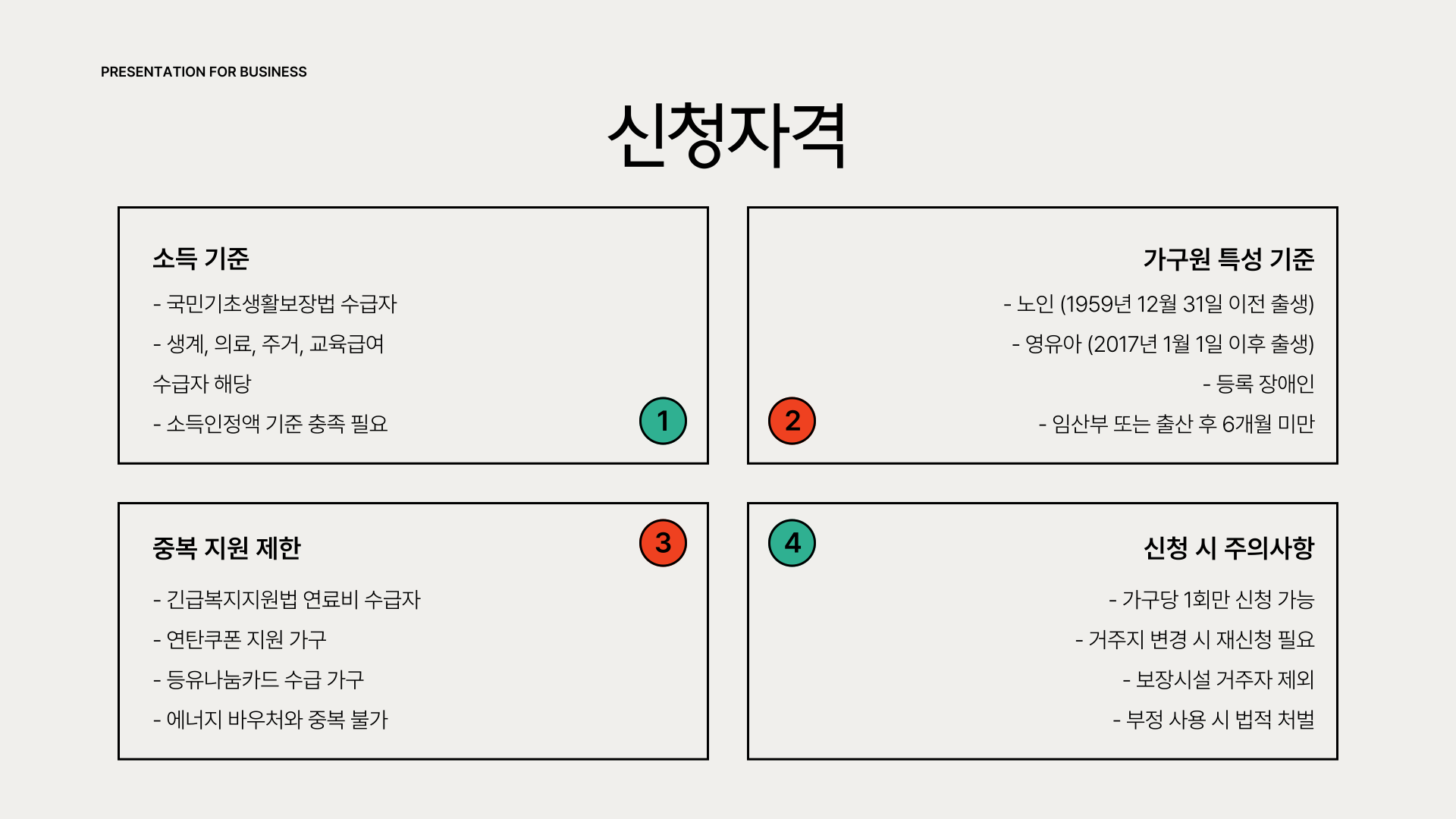 주의할 점은 ‘긴급복지지원법’에 따라 연료비를 이미 지원받고 있거나, ‘연탄쿠폰’을 지원받은 세대는 중복지원이 불가하다는 것입니다. 해당하는 경우에는 바우처 지원이 일부 중지되거나 금액 조정이 있을 수 있으니 꼭 담당 공무원에게 상담받으세요.