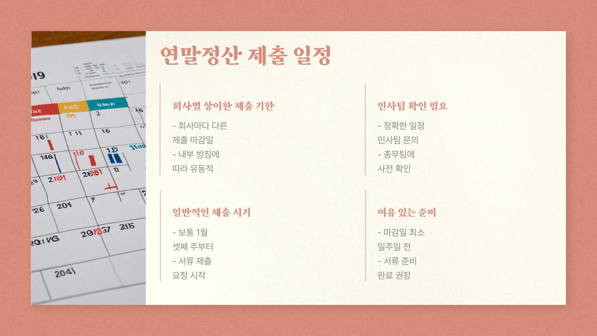 “언제까지 제출해야 하나요?” 이 질문 정말 많이 받습니다. 결론부터 말씀드리면, 회사마다 조금씩 달라요. 보통 1월 셋째 주부터 서류 제출을 요청하지만, 일정은 회사 내부 방침에 따라 유동적이니 미리 인사팀이나 총무팀에 확인하시는 게 좋습니다.