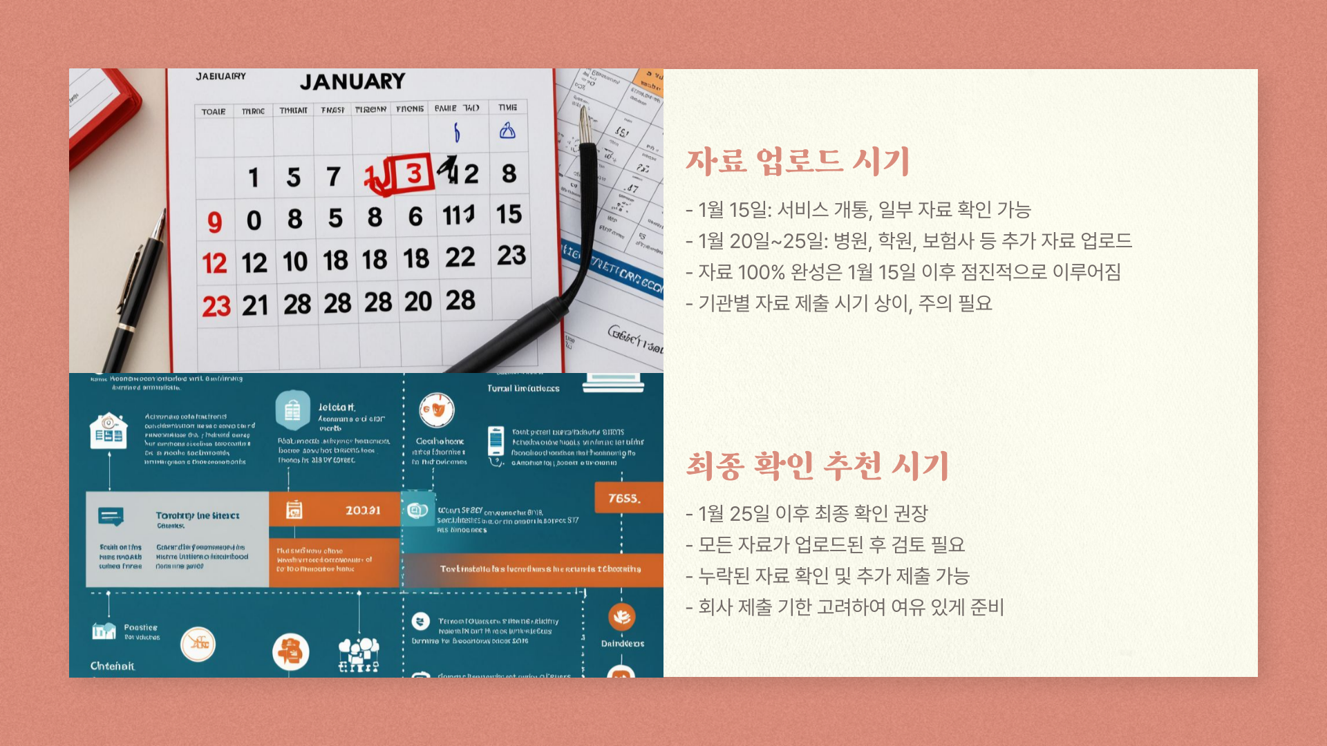 그리고 자료가 1월 15일에 100% 완성돼 있는 건 아니에요. 일부 병원, 학원, 보험사 등은 1월 20일~25일쯤 제출해서 1월 말이 지나야 모든 자료가 올라오는 경우도 많다는 사실! 그래서 저는 1월 25일 이후에 최종 확인하는 걸 추천드려요.