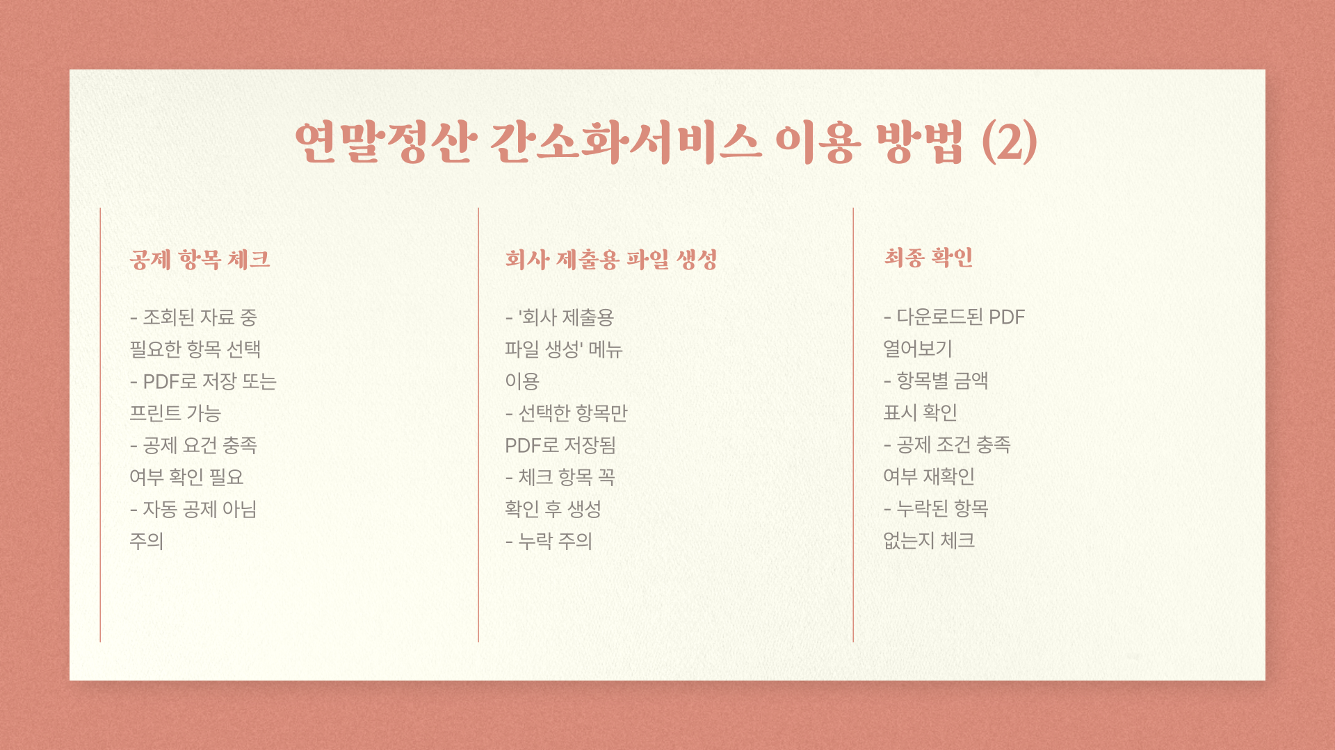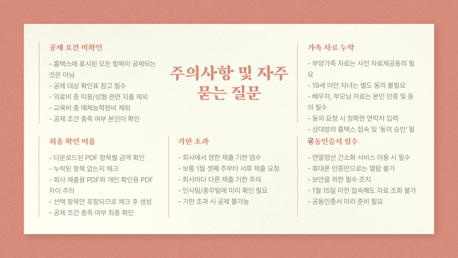 제가 연말정산 하면서 실수했던 것들, 여러분은 꼭 피하시길 바라며 주의사항을 아래에 정리했어요.