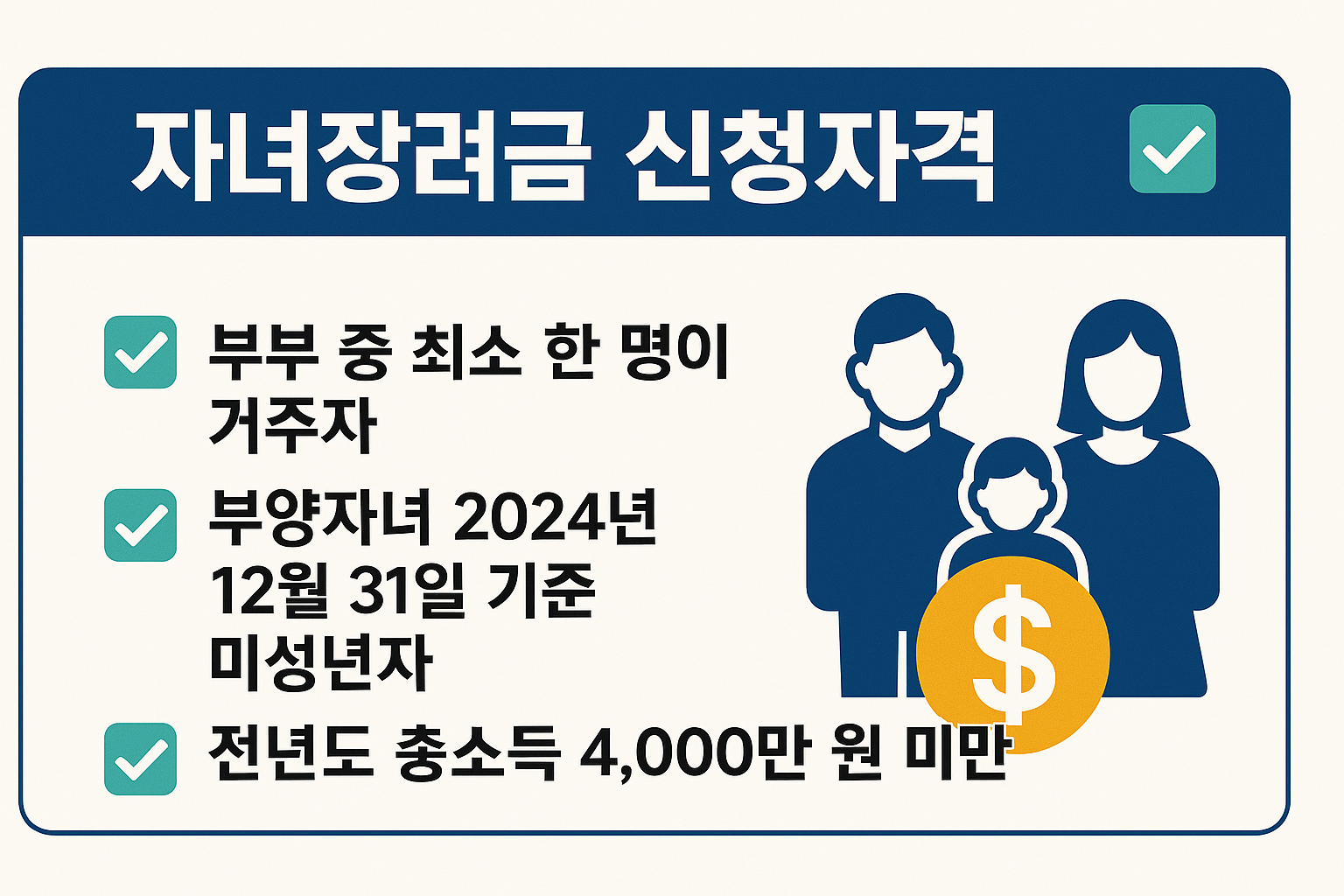 자녀장려금은 **부부합산 연 소득이 7천만 원 미만**일 경우 신청할 수 있습니다. 여기에는 근로소득뿐 아니라, 사업소득, 이자, 배당, 연금소득 등도 모두 포함됩니다.