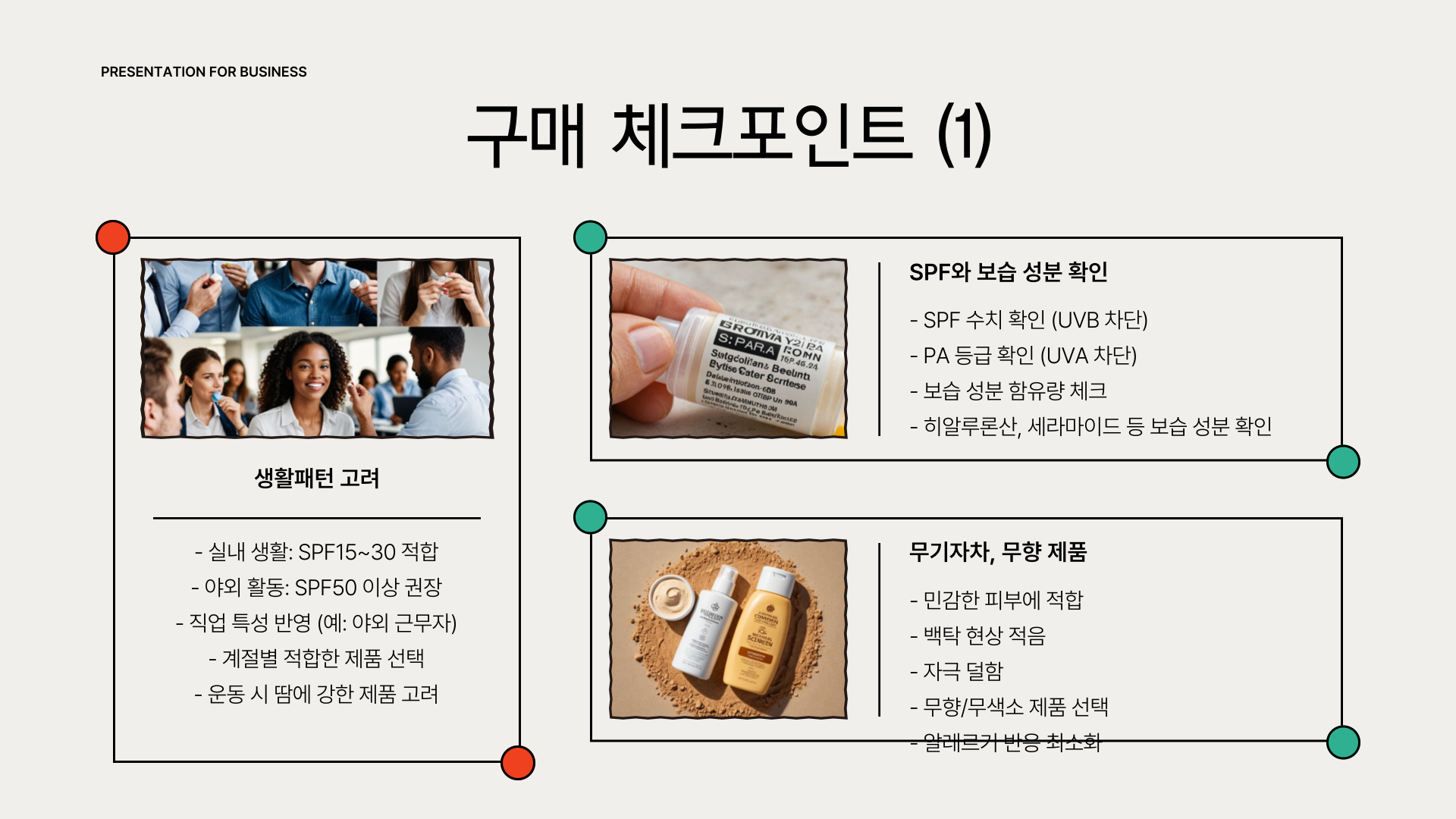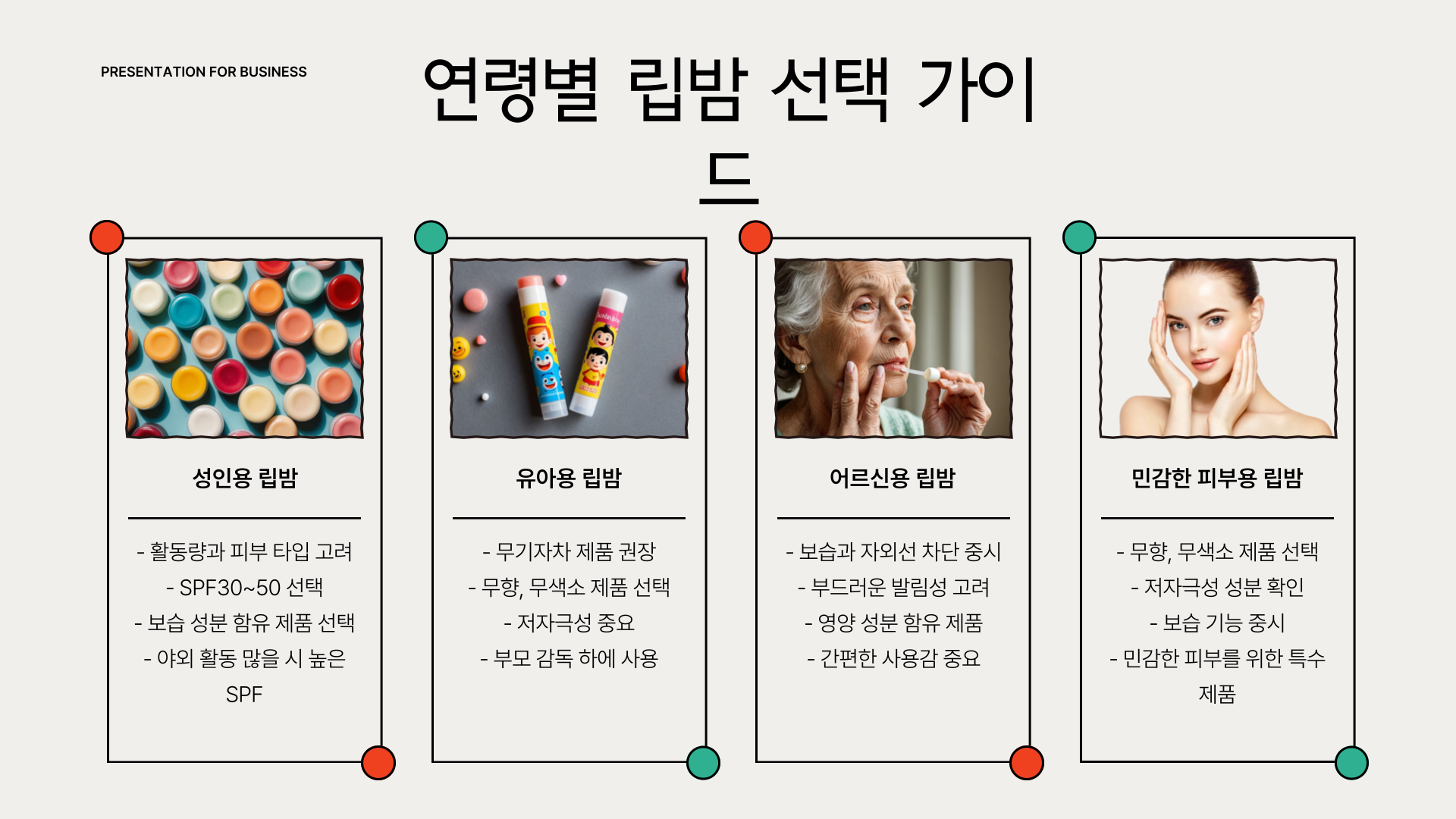성인은 활동량과 피부 타입에 따라 선택, 유아는 무기자차 위주로! 어르신들도 보습과 자외선 차단을 위한 전용 립밤이 필요합니다. 향에 민감한 분들을 위해 무향 제품도 다양하게 출시되어 있습니다.