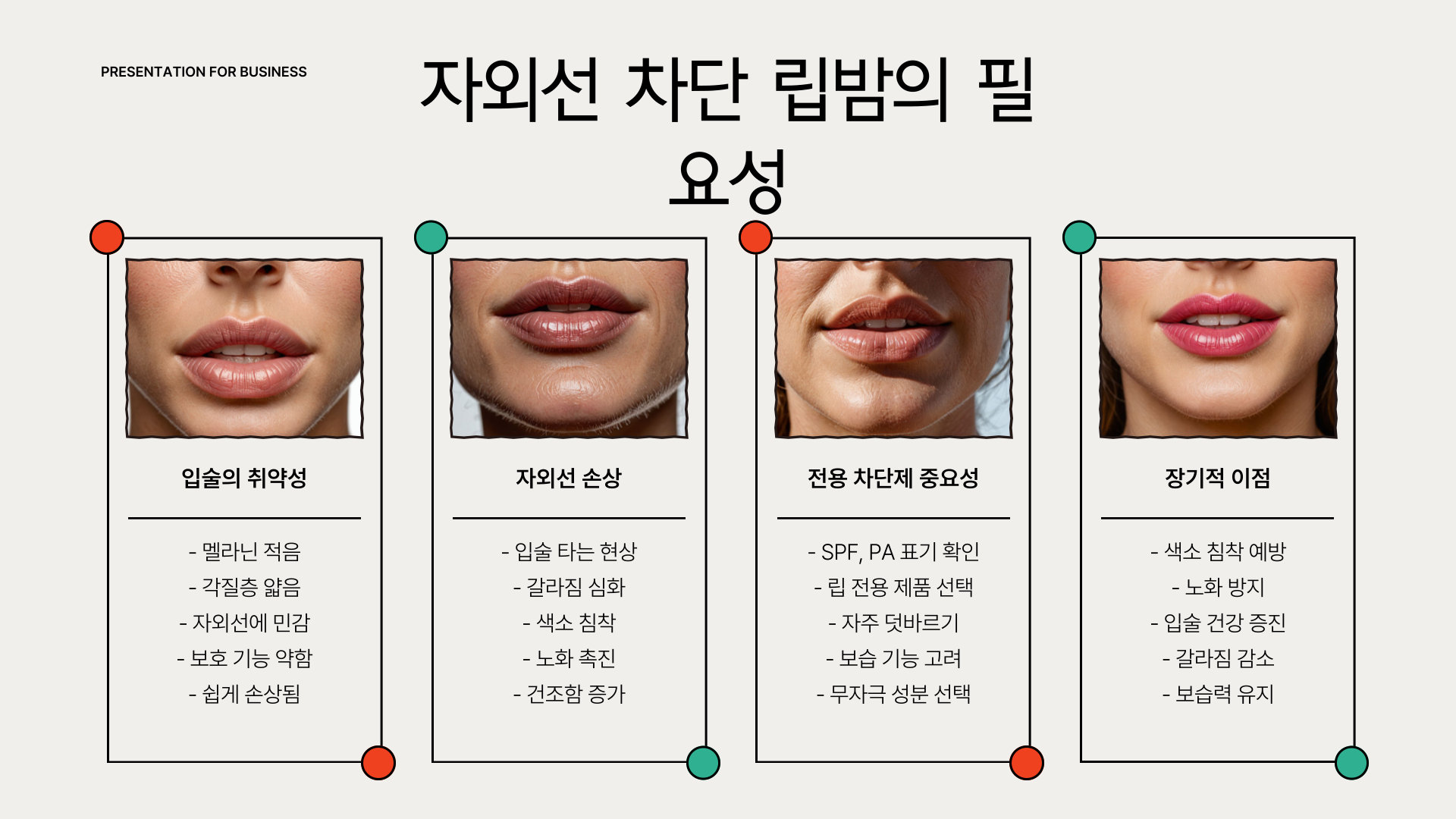 입술은 멜라닌이 적고 각질층도 얇아 자외선 손상에 더 취약합니다. 특히 SPF와 PA 등급이 명시된 립밤을 선택해주는 것이 중요합니다.