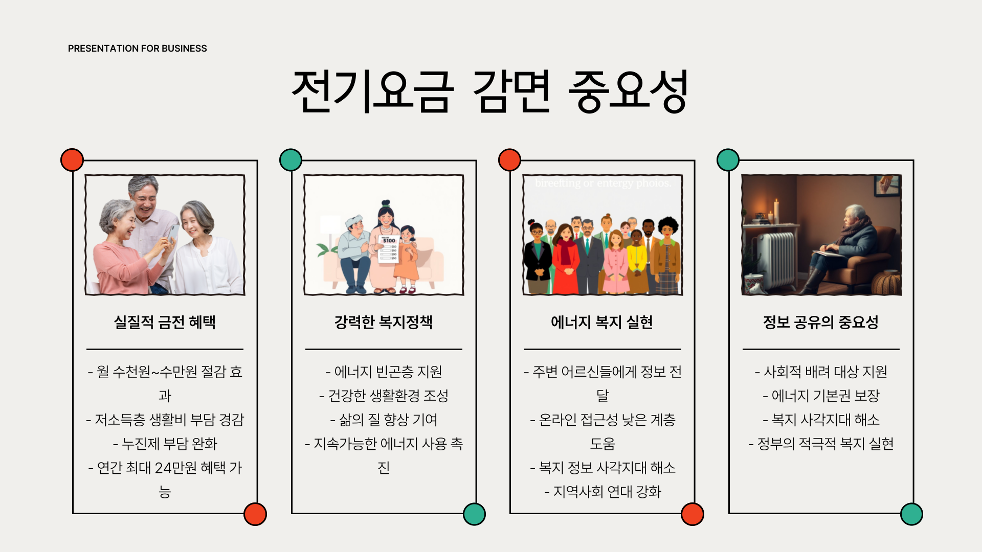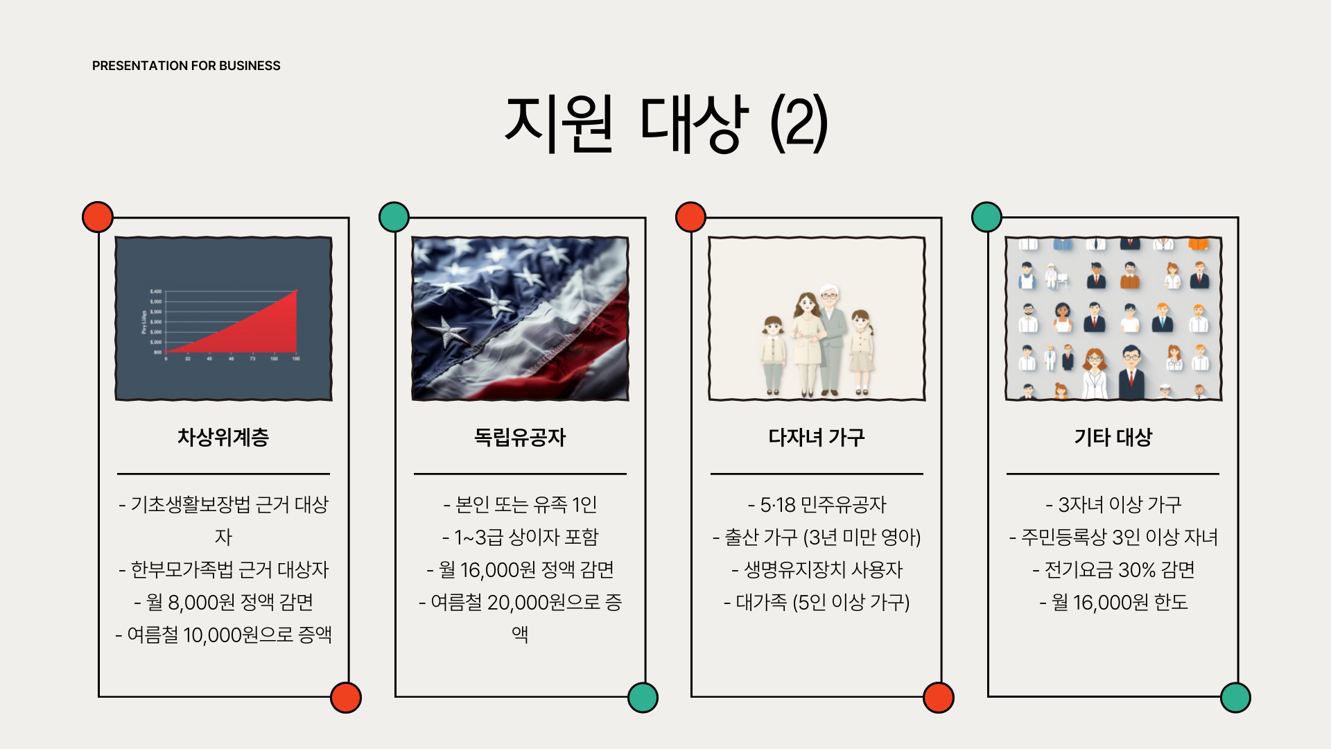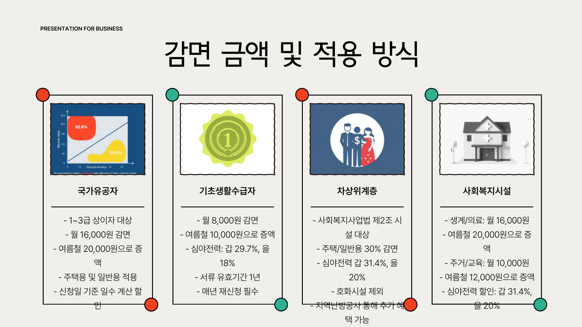 - 전기요금의 30% 감면, 월 16,000원 한도