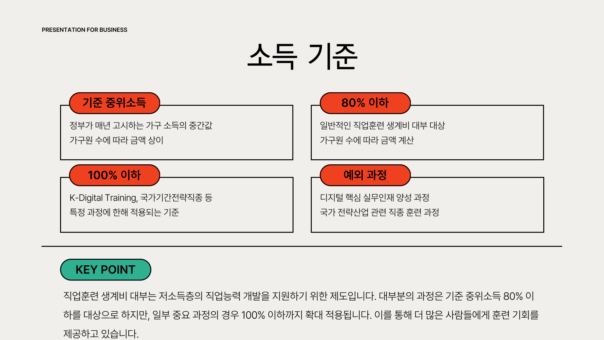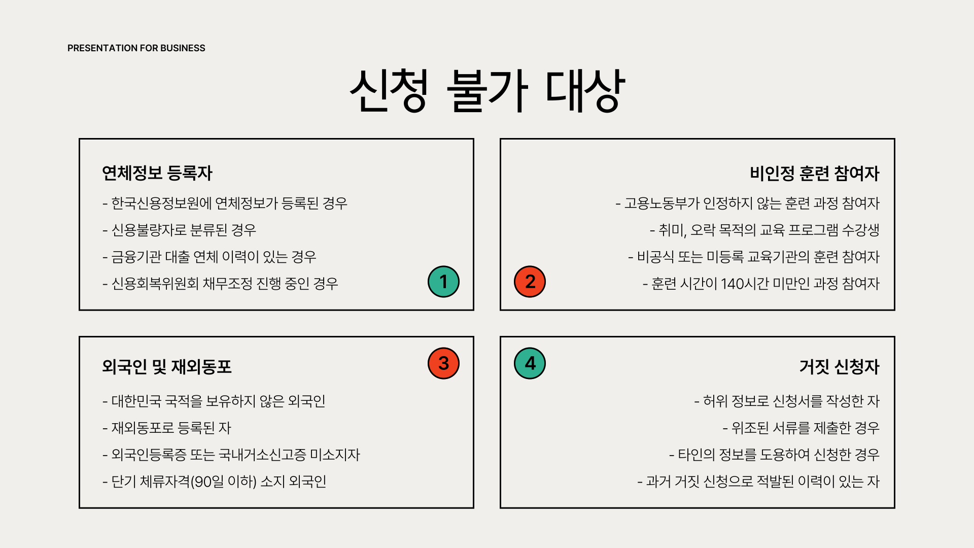 또한, 가구원의 합산 소득이 기준 중위소득 80% 이하여야 하며, 일부 과정(K-Digital Training, 국가기간전략직종 등)은 중위소득 100% 이하까지 가능합니다.