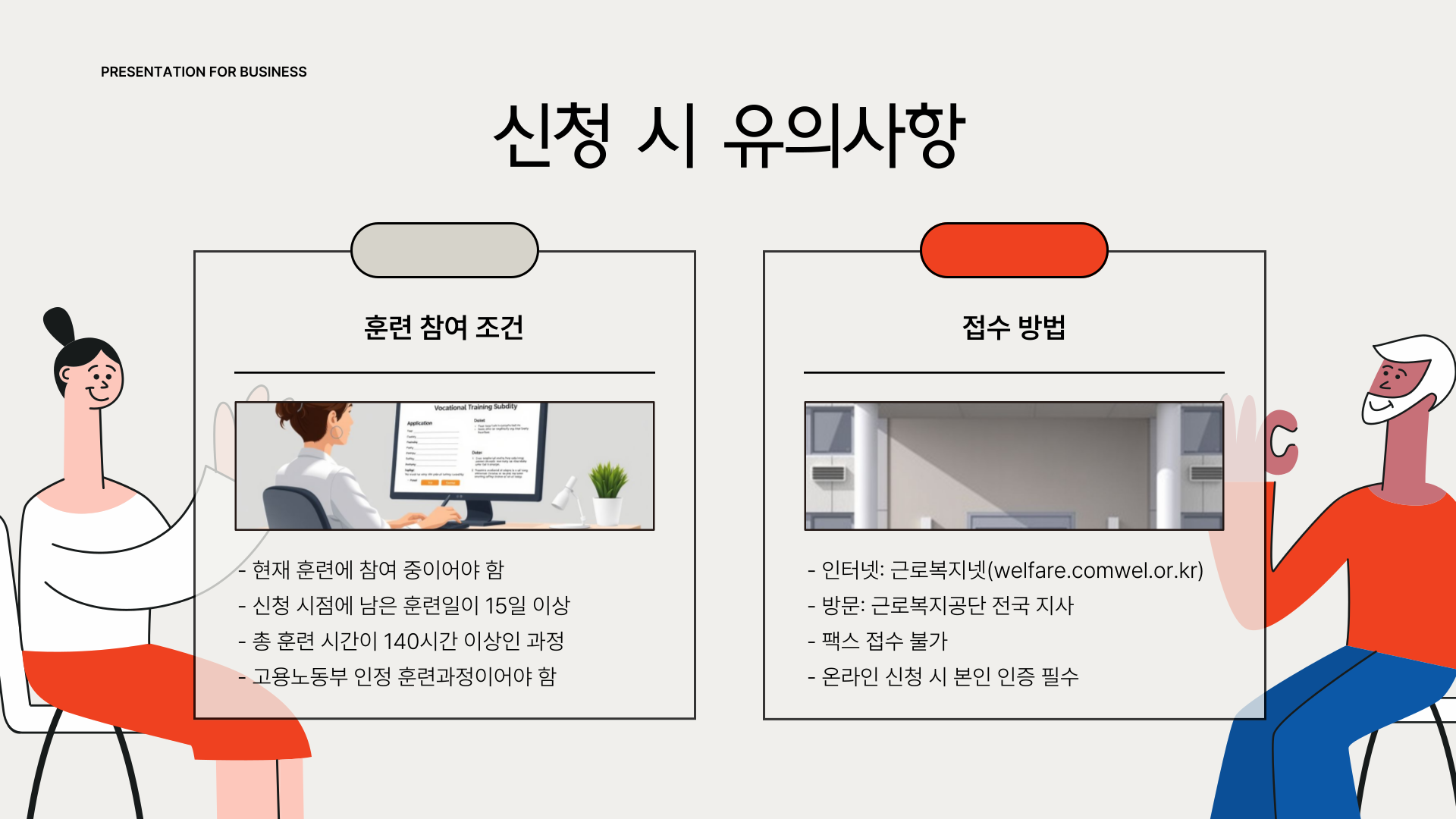 또한, 신청 시 훈련 참여 중이며 남은 훈련일이 15일 이상이어야 합니다. 접수는 인터넷(근로복지넷) 또는 방문(전국 지사) 중 택일하며, 팩스 접수는 불가합니다.