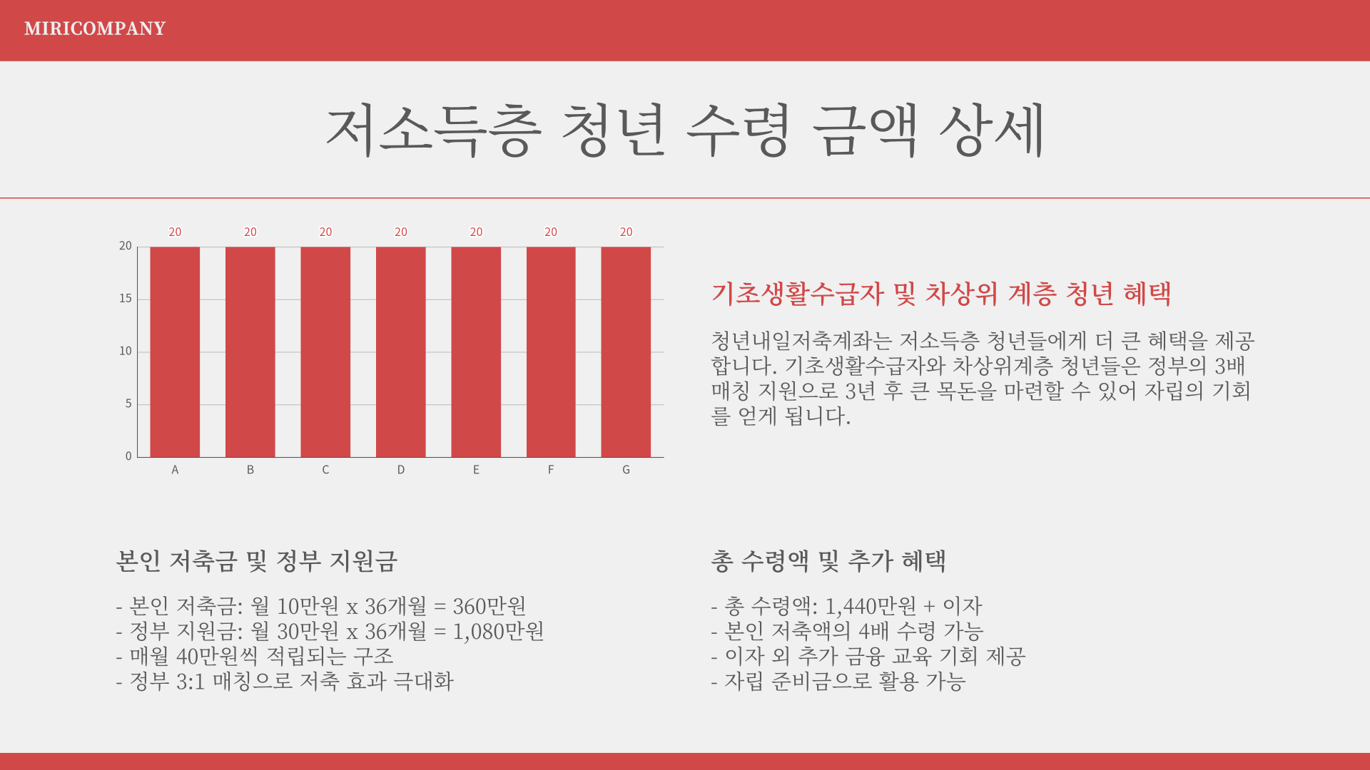 기존 청년저축계좌보다 지원 조건이 완화되어 더 많은 청년이 혜택을 받을 수 있습니다. 지원금도 확대되어, 일반 청년은 720만 원, 기초생활수급자는 1,440만 원까지 받을 수 있어요.