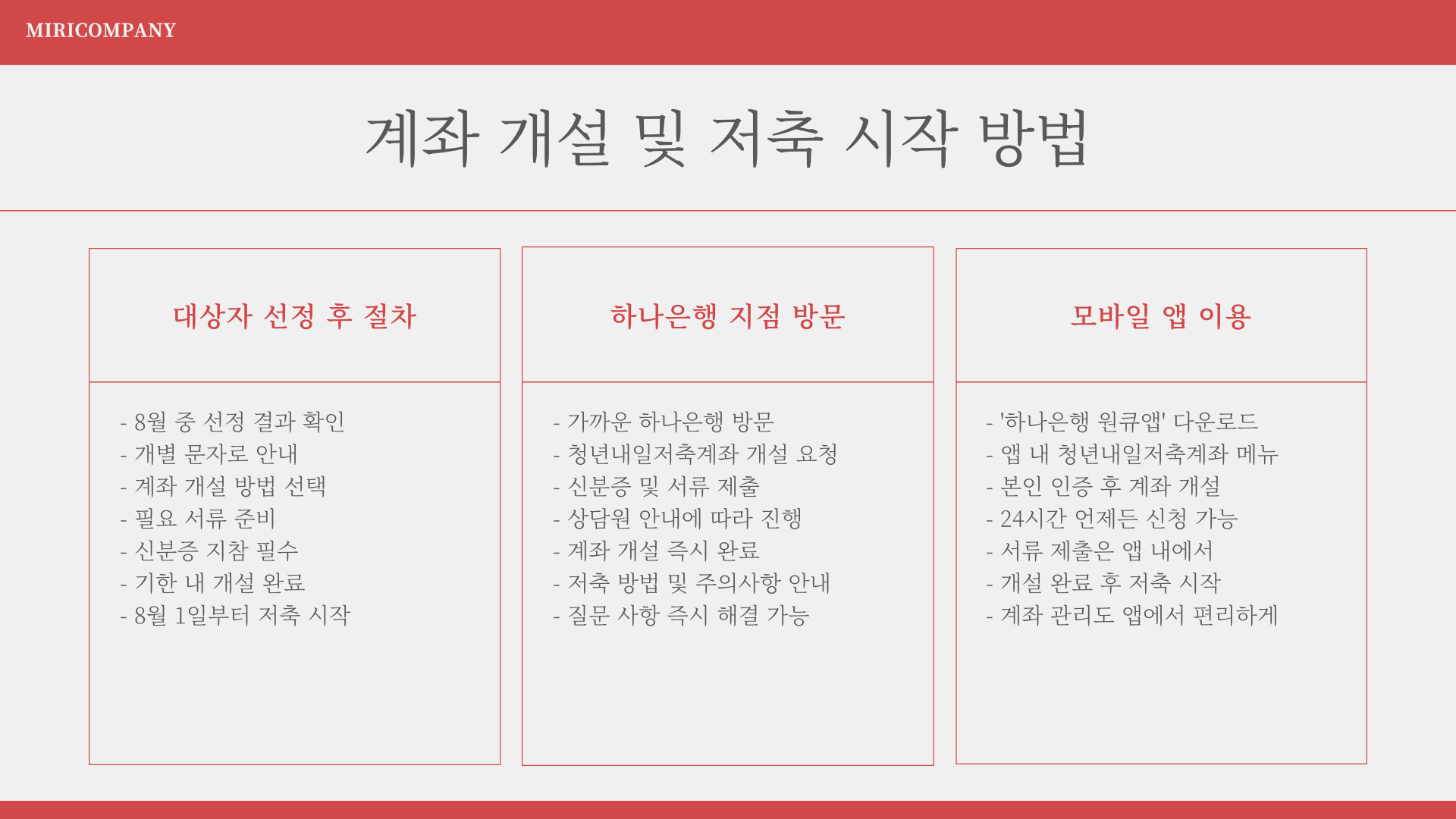 대상자로 선정된 청년은 8월 중 하나은행 지점을 방문하거나 모바일 '하나은행 원큐앱'을 통해 계좌를 개설한 후, 저축을 시작하면 됩니다.